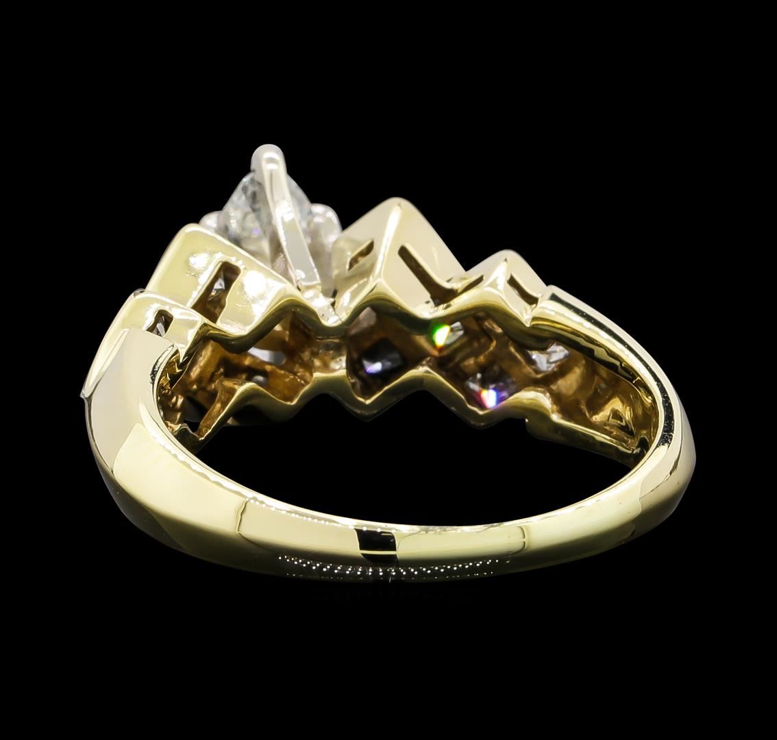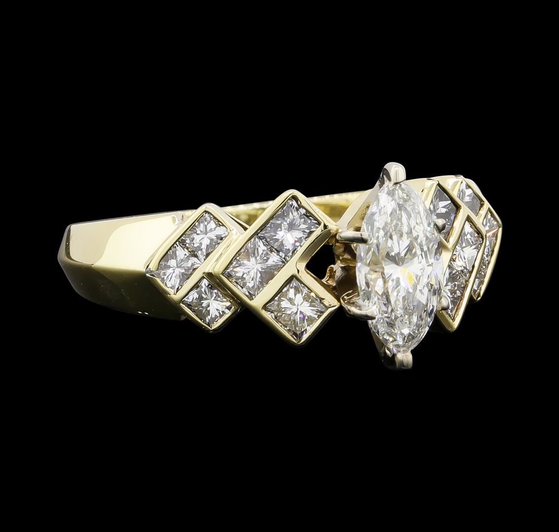 One electronically tested 14KT yellow and white gold lady's combination cast & assembled wedding ring with a knife edge cathedral shank with a bright polish finish. The featured lady's ring has a shank measuring 2.18 millimeters wide. Identified with markings of '14K'. Condition is like new, good workmanship. Containing: One prong set marquise shaped cut diamond, measuring 8.45 x 4.65 x 3.80mm (depth est.) approximate weight of 0.85ct. Graded in the setting. Clarity I-1. Color: G - H Cut Good Six channel set princess cut diamonds, measuring 2.70 x 2.30 x 1.73mm (depth est.) approximate total weight of 6 Stones = 0.50ct. Graded in the setting. Clarity VS-1 to VS-2. Color: H - J Cut Good Six channel set princess cut diamonds, measuring 2.30 x 2.00 x 1.50mm (depth est.) approximate total weight of 6 Stones = 0.30ct. Graded in the setting. Clarity VS-1 to VS-2. Color: H - I Cut Good. Total Weight of Diamonds 1.65ct.. Total Weight of Ring 5.40gm. GAS Appraised at $6,520.00.