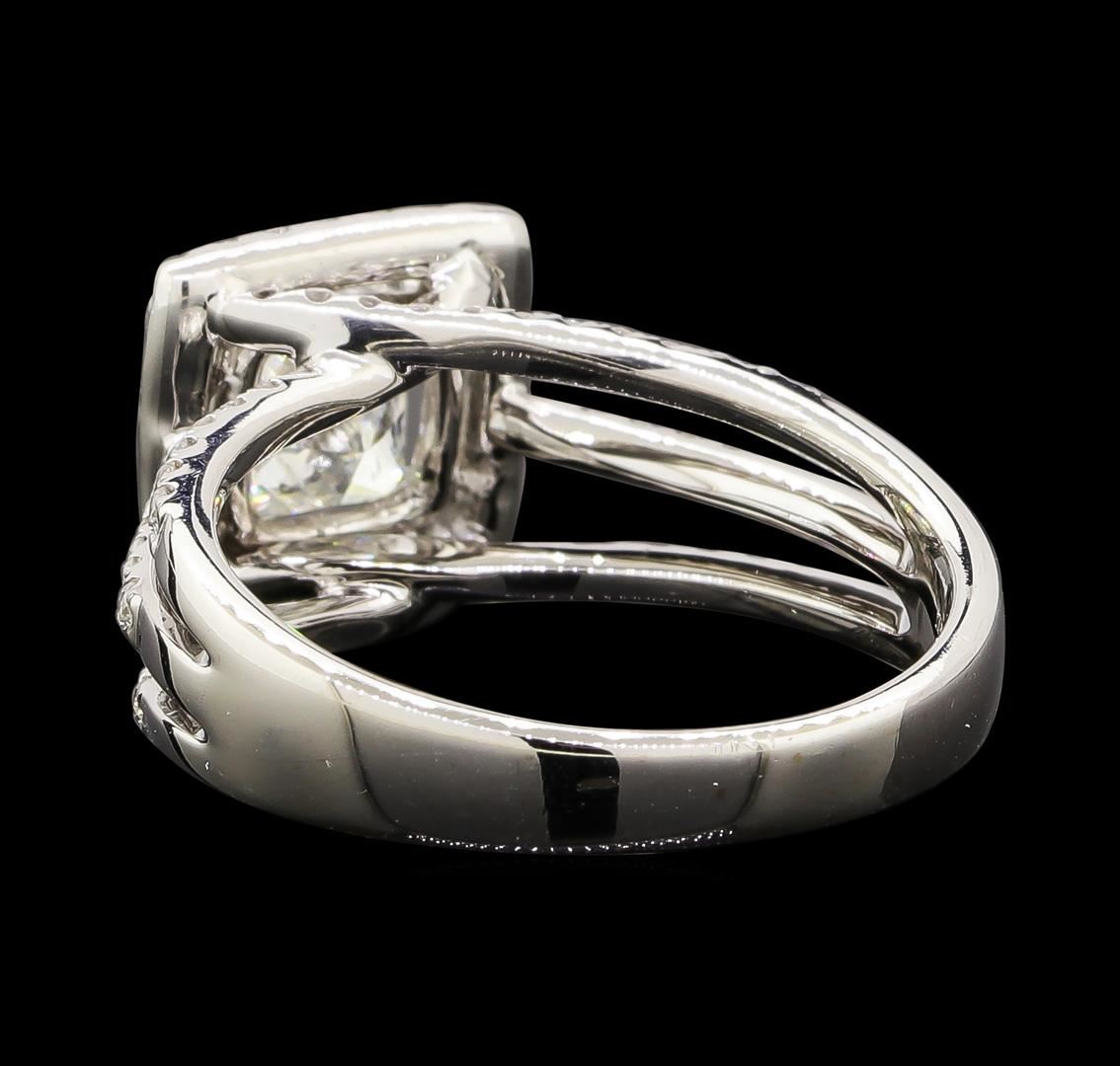 One electronically tested 18KT white gold lady's combination cast & assembled wedding ring with a triple split crossover shank with a bright polish finish. The featured lady's ring has a halo and a shank measuring 2.81 millimeters wide. Identified with markings of '18K'. Condition is new, good workmanship. Containing: One prong set princess rectangular cut diamond, measuring 5.56 x 5.21 x 3.88mm (depth est.) approximate weight of 1.05ct. Graded in the setting. Clarity I-1. Color: I - J Cut Very Good Seventy-Six prong set round brilliant cut diamonds, measuring 1.30 - 1.25 x 0.79mm (depth est.) approximate total weight of 76 Stones = 0.60ct. Graded in the setting. Clarity SI-1 to SI-2. Color: G - I Cut Good. Total Weight of Diamonds 1.65ct.. Total Weight of Ring 5.60gm. GAS Appraised at $10,490.00.
