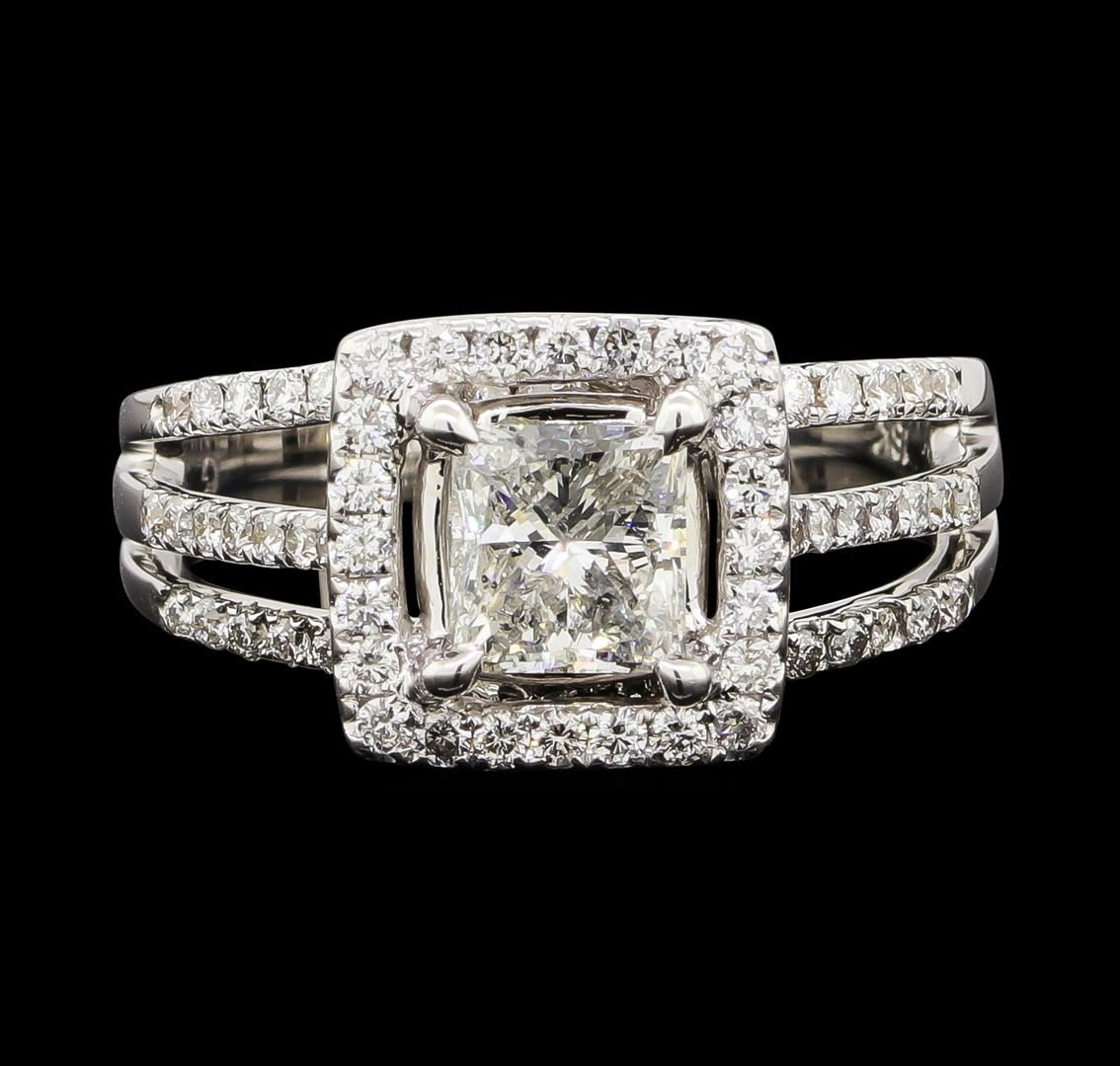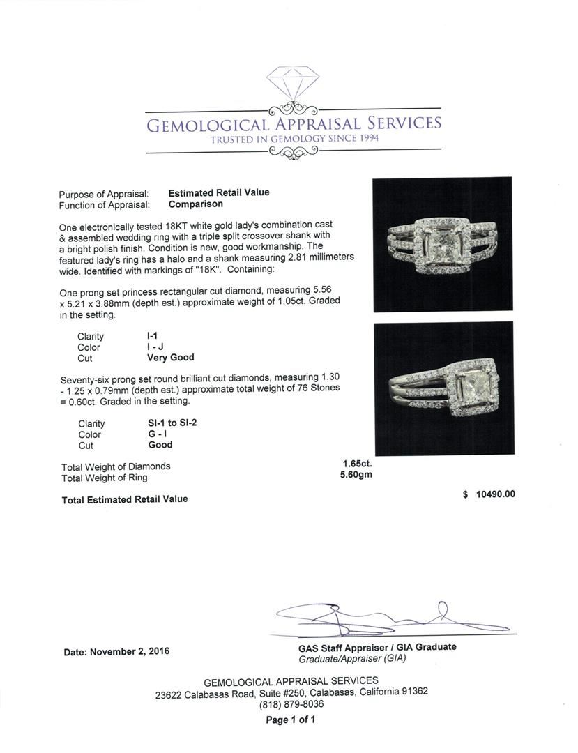 One electronically tested 18KT white gold lady's combination cast & assembled wedding ring with a triple split crossover shank with a bright polish finish. The featured lady's ring has a halo and a shank measuring 2.81 millimeters wide. Identified with markings of '18K'. Condition is new, good workmanship. Containing: One prong set princess rectangular cut diamond, measuring 5.56 x 5.21 x 3.88mm (depth est.) approximate weight of 1.05ct. Graded in the setting. Clarity I-1. Color: I - J Cut Very Good Seventy-Six prong set round brilliant cut diamonds, measuring 1.30 - 1.25 x 0.79mm (depth est.) approximate total weight of 76 Stones = 0.60ct. Graded in the setting. Clarity SI-1 to SI-2. Color: G - I Cut Good. Total Weight of Diamonds 1.65ct.. Total Weight of Ring 5.60gm. GAS Appraised at $10,490.00.