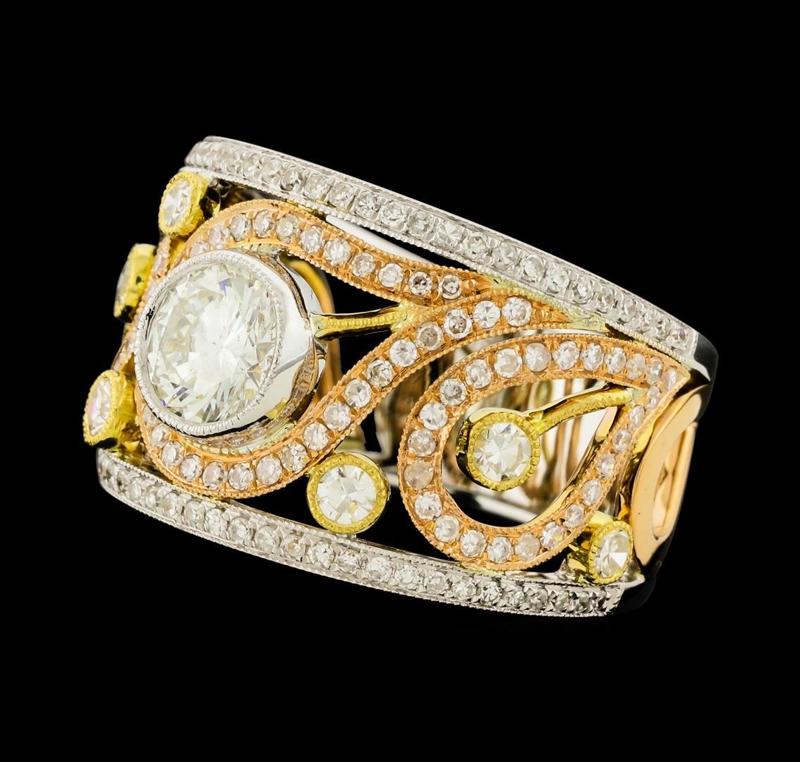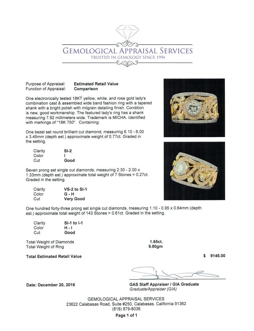 One electronically tested 18KT yellow, white, and rose gold lady's combination cast & assembled wide band fashion ring with a tapered shank with a bright polish with milgrain detailing finish. The featured lady's ring has a shank measuring 7.92 millimeters wide. Trademark is MICHA. Identified with markings of '18K 750'. Condition is new, good workmanship. Containing: One bezel set round brilliant cut diamond, measuring 6.10 - 6.00 x 3.45mm (depth est.) approximate weight of 0.77ct. Graded in the setting. Clarity SI-2. Color: I Cut Good Seven prong set single cut diamonds, measuring 2.30 - 2.00 x 1.33mm (depth est.) approximate total weight of 7 Stones = 0.27ct. Graded in the setting. Clarity VS-2 to SI-1. Color: G - H Cut Very Good One Hundred Forty-Three prong set single cut diamonds, measuring 1.10 - 0.95 x 0.64mm (depth est.) approximate total weight of 143 Stones = 0.61ct. Graded in the setting. Clarity SI-1 to I-1. Color: H - I Cut Good. Total Weight of Diamonds 1.65ct.. Total Weight of Ring 9.80gm. GAS Appraised at $9,145.00.