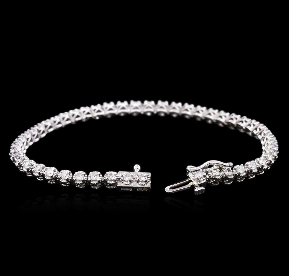 One electronically tested 14KT white gold lady's combination cast & assembled tennis bracelet with a tongue clasp with foldover safety with a bright polish finish. The featured lady's bracelet measures 7 inches in length. Identified with markings of "14K". Condition is new, good workmanship. Containing: Forty-Nine prong set round brilliant cut diamonds, measuring 2.10 - 2.00 x 1.31mm (depth est.) approximate total weight of 49 Stones = 1.65ct. Graded in the setting. Clarity: SI-1 to SI-2. Color: G - I. Cut Good. Total Weight of Diamonds 1.65ct. Total Weight of Bracelet 10.10gm. GAS Appraised.