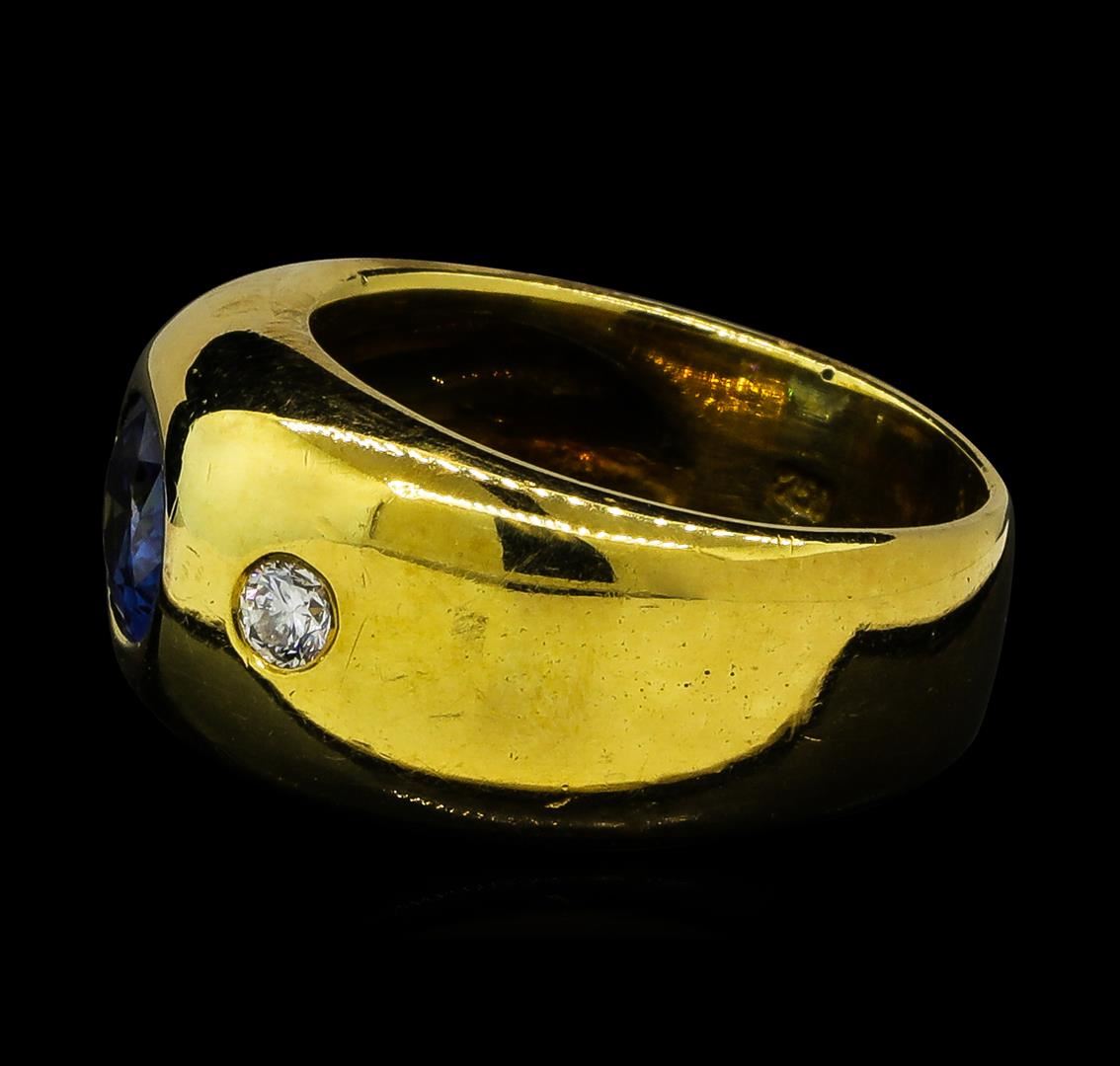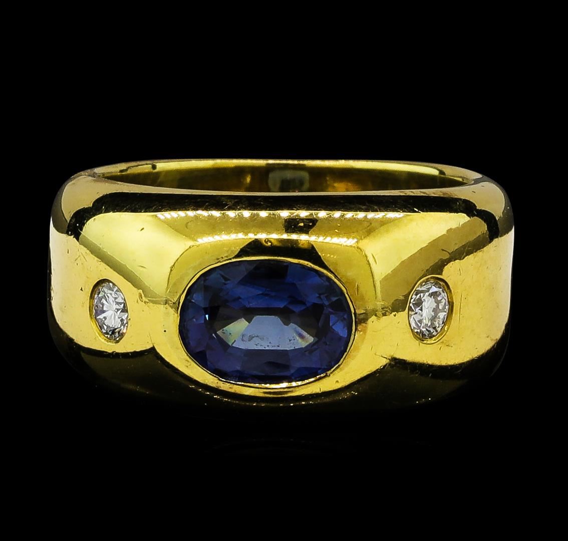 One electronically tested 18KT yellow gold cast sapphire and diamond ring. The featured sapphire is set within a yellow gold curvature with a single diamond accent on either side supported by tapering shoulders, completed by a six millimeter wide band. Bright polish finish. Identified with markings of '750'. Condition is good. Containing: One flush set oval mixed cut natural blue sapphire, measuring 8.00 x 6.00 x 3.90mm, 5%. bulge factor, approximate weight of 1.65ct., clarity is slightly included, type II, medium dark, very slightly grayish, blue color, (GIA B 6/3), cut is good. Transmitting light with a minimum of distortion, transparent. Naturally occurring internal & external characteristics are present. Graded in the setting. Two flush set round brilliant cut diamonds, measuring 2.90 - 2.80 x 1.80mm (depth est.) approximate total weight of 2 Stones = 0.18ct. Graded in the setting. Clarity SI-1 to I-1. Color: F. Total Weight of Colored Stones 1.65ct.. Total Weight of Diamonds 0.18ct.. Total Weight of Ring 13.27gm. AIG Appraised at $5,785.00.