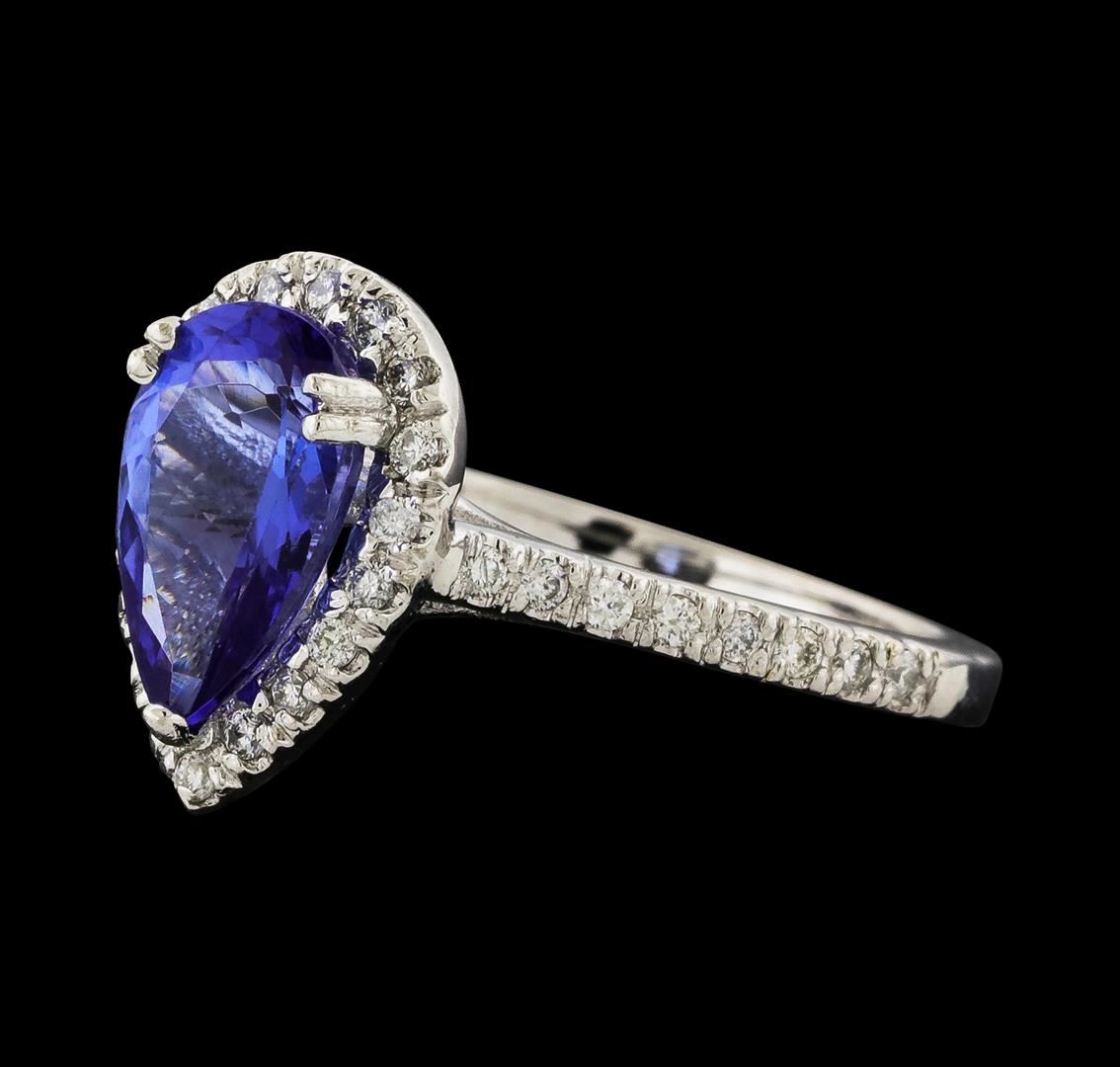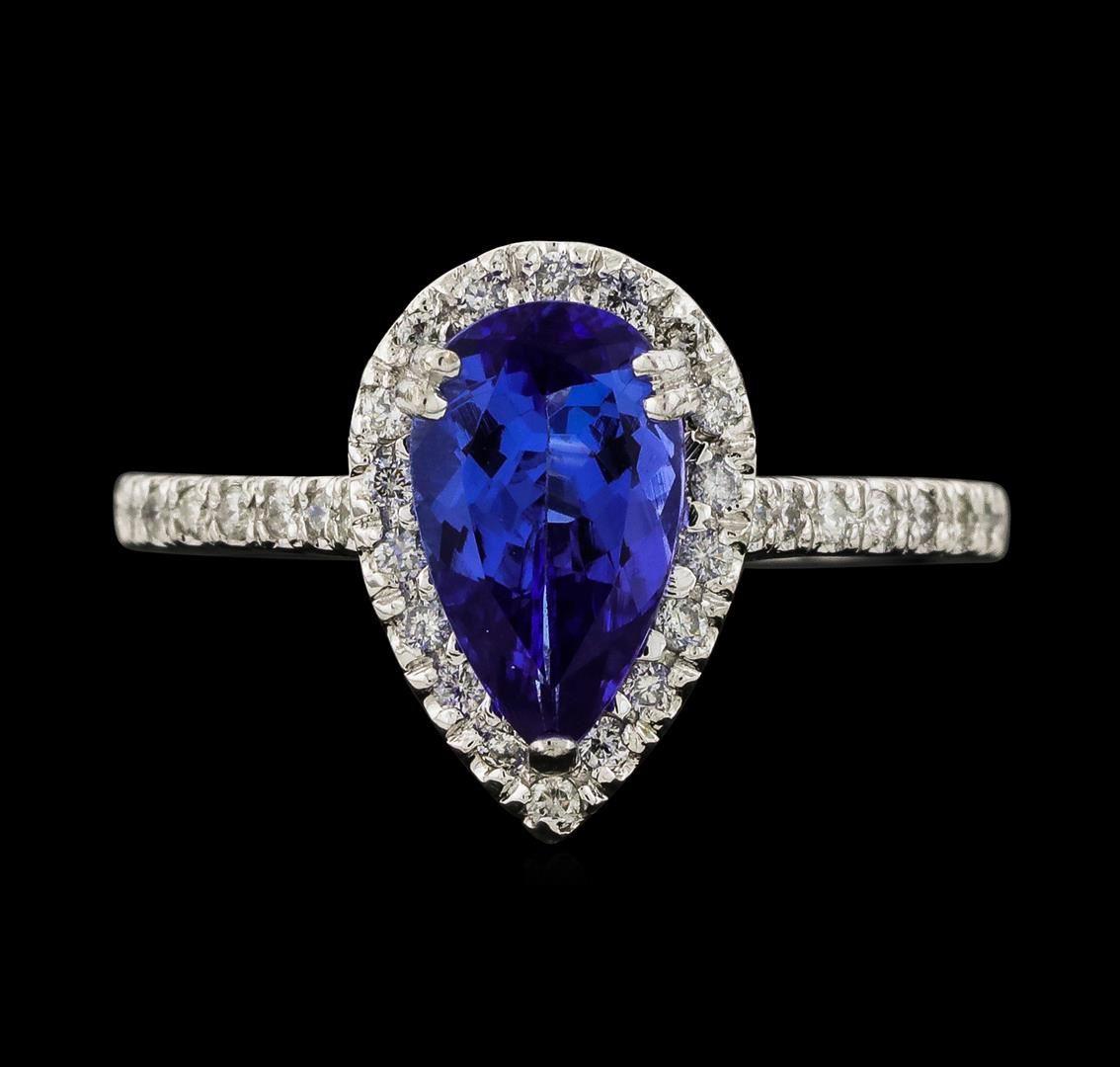 One Tanzanite and Diamond Ring featuring: 14KT White Gold with a total weight of 3.30 grams, Tanzanite with a total weight of 1.65ct, and 34 diamonds with a total weight of 0.27ctw.