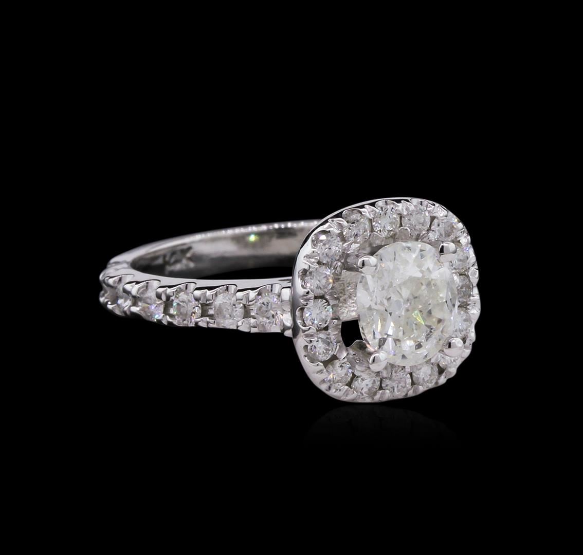 One electronically tested 14KT white gold lady's cast wedding ring with a halo with a bright polish finish. The featured lady's ring has a shank measuring 2.50 millimeters wide. Identified with markings of "14K". Condition is new, good workmanship. Containing: One prong set oval shaped cut diamond, measuring 6.64 x 5.78 x 3.80mm (depth est.) , 10.00.%. GTCF approximate weight of 1.00ct. Graded in the setting. Clarity: I-1. Color: H. Cut Fair Thirty prong set round brilliant cut diamonds, measuring 1.85 - 1.65 x 1.13mm (depth est.) approximate total weight of 30 Stones = 0.65ct. Graded in the setting. Clarity: SI-1 to I-1. Color: G - I. Cut Good. Total Weight of Diamonds 1.65ct. Total Weight of Ring 3.70gm. GAS Appraised.