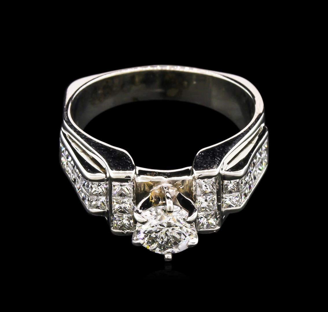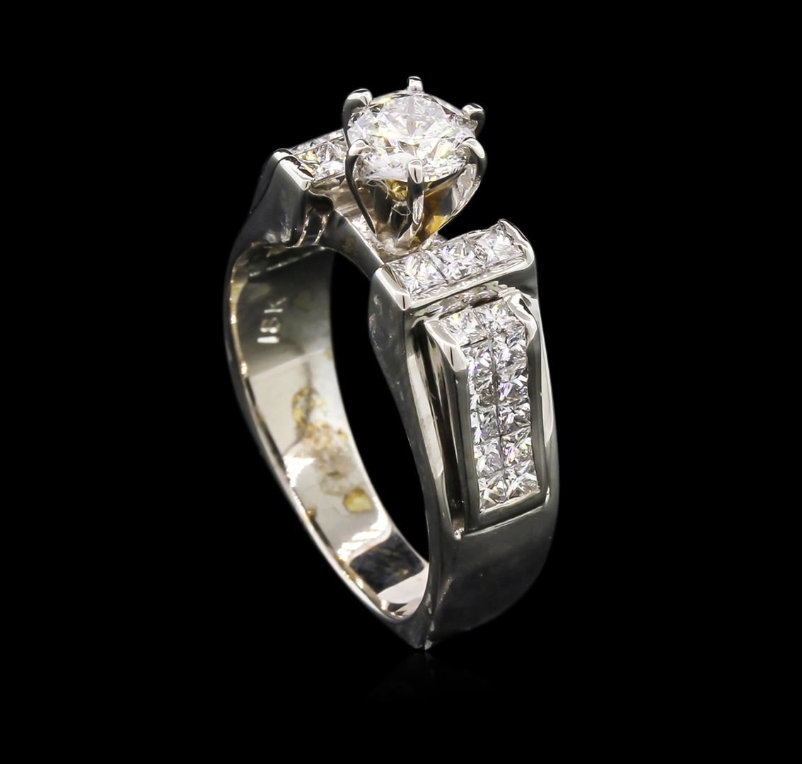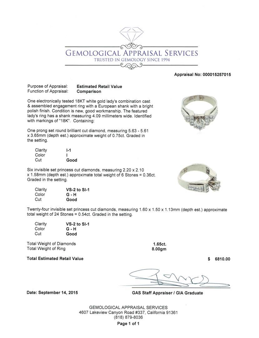 One electronically tested 18KT white gold lady's combination cast & assembled engagement ring with a European shank with a bright polish finish. The featured lady's ring has a shank measuring 4.09 millimeters wide. Identified with markings of "18K". Condition is new, good workmanship. Containing: One prong set round brilliant cut diamond, measuring 5.63 - 5.61 x 3.65mm (depth est.) approximate weight of 0.75ct. Graded in the setting. Clarity: I-1. Color: I. Cut Good Six invisible set princess cut diamonds, measuring 2.20 x 2.10 x 1.58mm (depth est.) approximate total weight of 6 Stones = 0.36ct. Graded in the setting. Clarity: VS-2 to SI-1. Color: G - Good Twenty-Four invisible set princess cut diamonds, measuring 1.60 x 1.50 x 1.13mm (depth est.) approximate total weight of 24 Stones = 0.54ct. Graded in the setting. Clarity: VS-2 to SI-1. Color: G - Good. Total Weight of Diamonds 1.65ct. Total Weight of Ring 8.00gm. GAS Appraised at $6,810.00.
