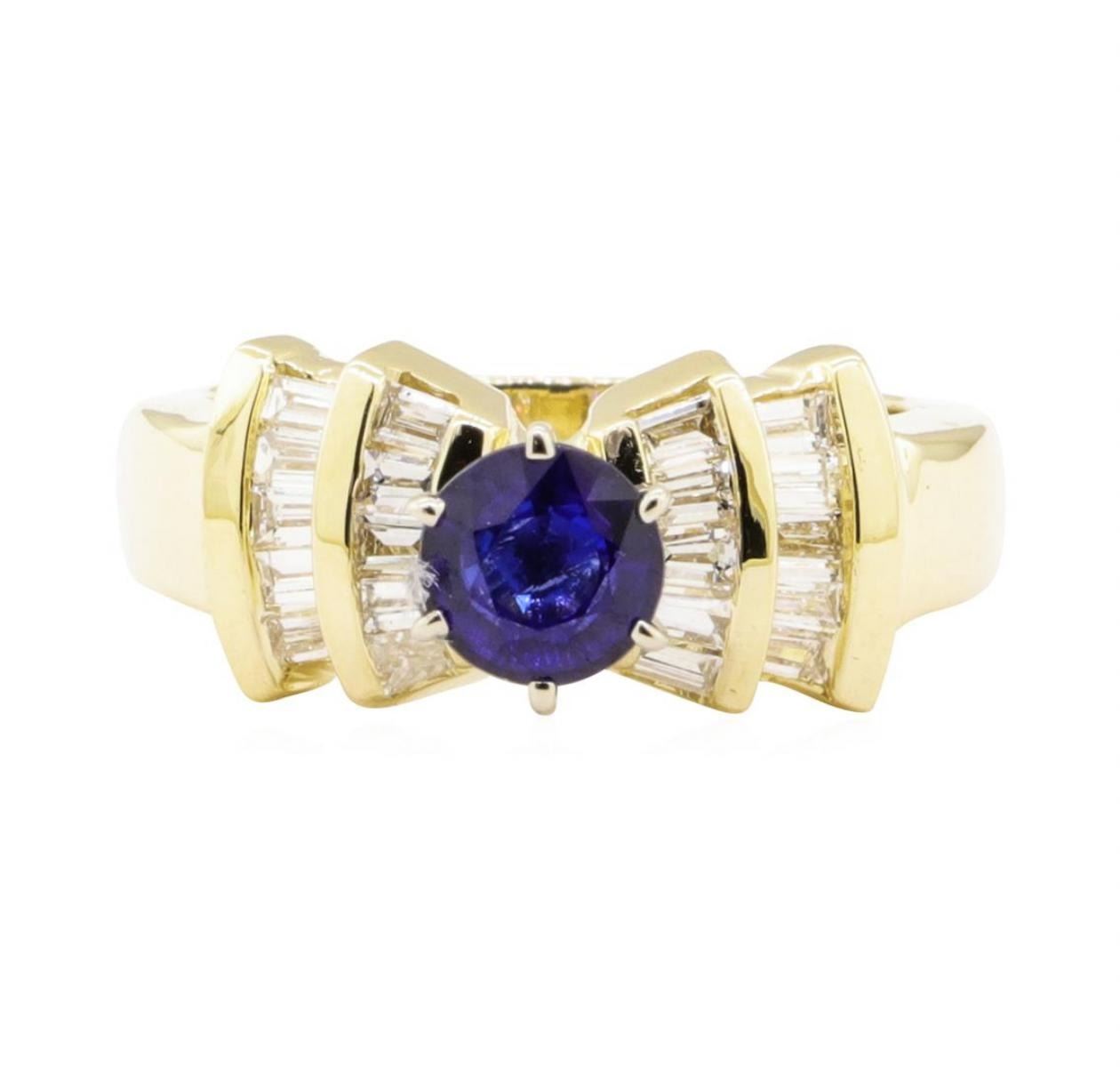 One electronically tested 14KT yellow gold lady's combination cast & assembled fashion ring with a bow motif with a bright polish finish. The featured lady's ring has a shank measuring 3.50 millimeters wide. Identified with markings of '14K'. Condition is new, good workmanship. Containing: One prong set round modified mixed cut natural blue sapphire, measuring 5.81 - 5.77 x 3.60 mm, (depth est.) approximate weight of 0.95ct., clarity is slightly included, medium dark, moderately strong, blue color, (GIA B 6/4), cut is good. Transmitting light with a minimum of distortion, transparent. Colored gemstones are presumed to have been subjected to commonly used enhancement processes. Graded in the setting. Twenty channel set baguette cut diamonds, measuring from 1.80 x 1.50 x 1.28mm (depth est.) to 2.00 x 1.60 x 1.36mm (depth est.) approximate total weight of 20 Stones = 0.71ct. Graded in the setting. Color H - I Clarity VS-1 to VS-2 Cut Very Good. Total Weight of Colored Stones 0.95ct.. Total Weight of Diamonds 0.71ct.. Total Weight of Ring 8.60gm GAS Appraised at $4085.00. GAS Appraised.