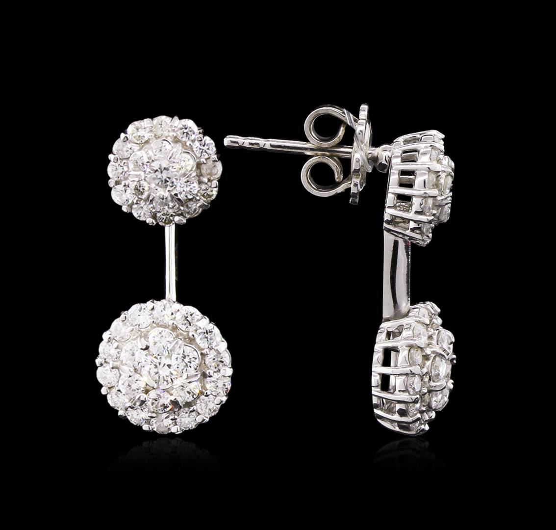 One pair electronically tested 14KT white gold lady's combination cast & assembled drop style earrings with friction posts with a bright polish finish. Identified with markings of "585". Condition is new, good workmanship. Containing: Four prong set round brilliant cut diamonds, measuring 2.60 - 2.40 x 1.50mm (depth est.) approximate total weight of 4 Stones = 0.23ct. Graded in the setting. Clarity: SI-1 to SI-2 . Color: H - I. Cut Good Thirty-Six prong set round brilliant cut diamonds, measuring 1.55 - 1.40 x 0.95mm (depth est.) approximate total weight of 36 Stones = 0.45ct. Graded in the setting. Clarity: SI-1 to I-1 . Color: H - I. Cut Good Forty prong set round brilliant cut diamonds, measuring 1.90 - 1.80 x 1.17mm (depth est.) approximate total weight of 40 Stones = 0.98ct. Graded in the setting. Clarity: SI-1 to SI-2 . Color: H - I. Cut Good. Total Weight of Diamonds 1.66ct.. Total Weight of Earrings 5.40gm at $ 4735.00 GAS Appraised.