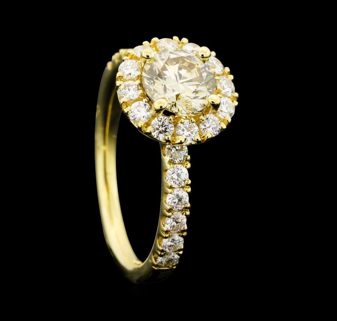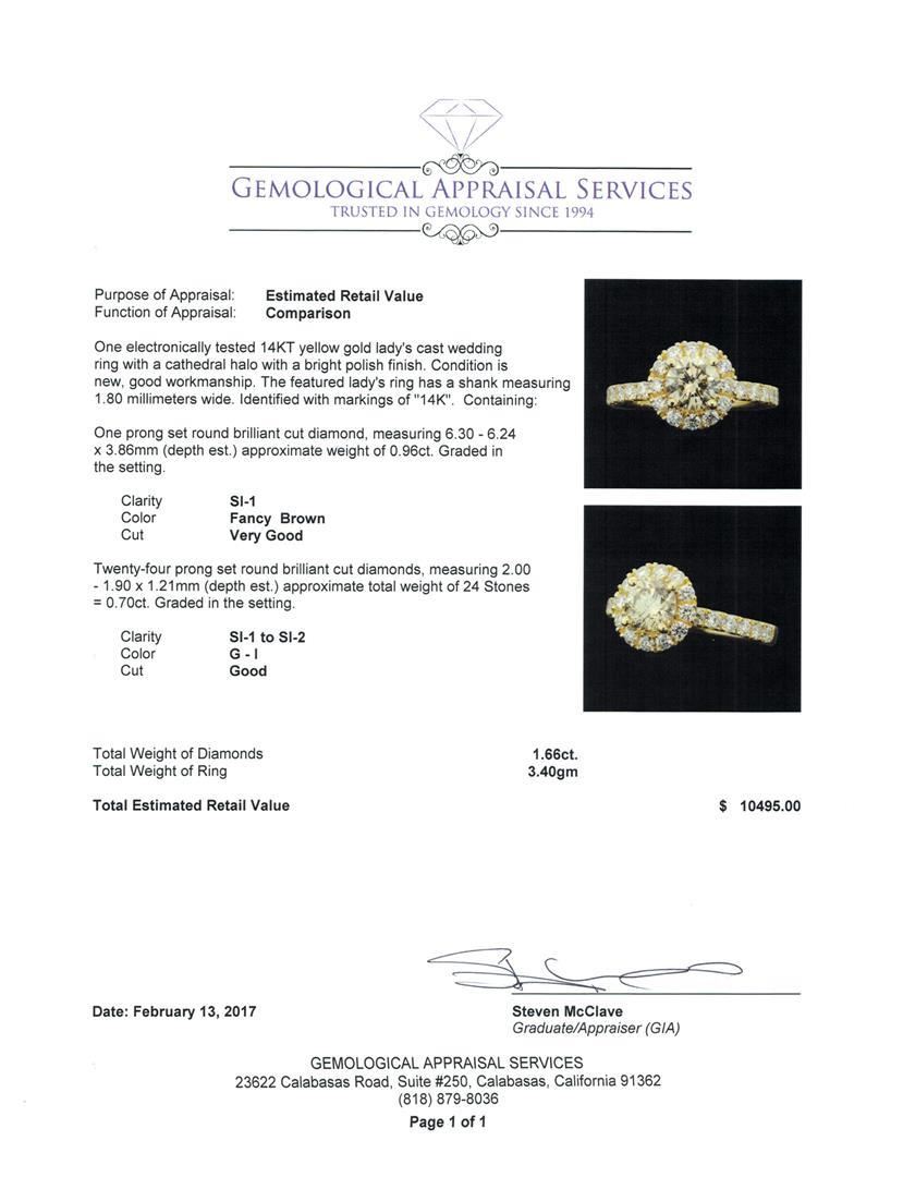 One electronically tested 14KT yellow gold lady's cast wedding ring with a cathedral halo with a bright polish finish. The featured lady's ring has a shank measuring 1.80 millimeters wide. Identified with markings of '14K'. Condition is new, good workmanship. Containing: One prong set round brilliant cut diamond, measuring 6.30 - 6.24 x 3.86mm (depth est.) approximate weight of 0.96ct. Graded in the setting. Clarity SI-1 Cut Very Good Twenty-Four prong set round brilliant cut diamonds, measuring 2.00 - 1.90 x 1.21mm (depth est.) approximate total weight of 24 Stones = 0.70 ct. Graded in the setting. Clarity SI-1 to SI-2. Color: G - I Cut Good. Total Weight of Diamonds 1.66ct.. Total Weight of Ring 3.40gm. GAS Appraised.