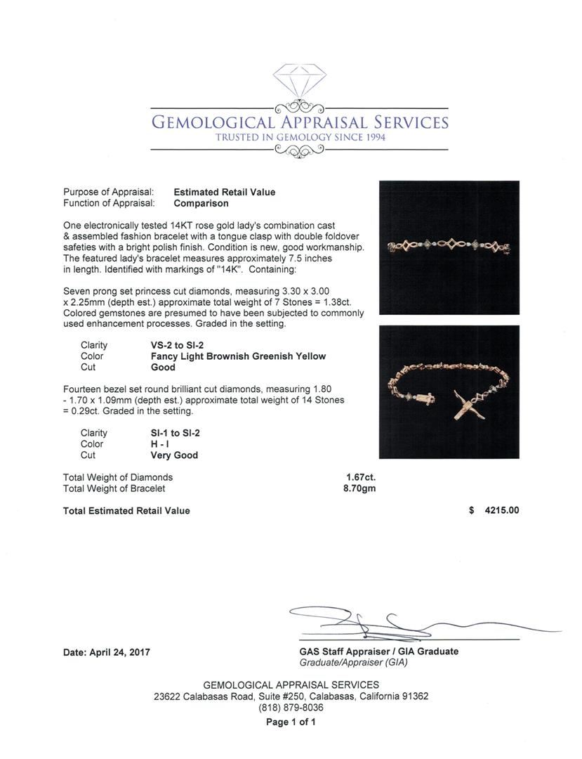 One electronically tested 14KT rose gold lady's combination cast & assembled fashion bracelet with a tongue clasp with double foldover safeties with a bright polish finish. The featured lady's bracelet measures approximately 7.5 inches in length. Identified with markings of '14K'. Condition is new, good workmanship. Containing: Seven prong set princess cut diamonds, measuring 3.30 x 3.00 x 2.25mm (depth est.) approximate total weight of 7 Stones = 1.38ct. Colored gemstones are presumed to have been subjected to commonly used enhancement processes. Graded in the setting. Color Fancy Light Brownish Greenish Yellow Clarity VS-2 to SI-2 Cut Good Fourteen bezel set round brilliant cut diamonds, measuring 1.80 - 1.70 x 1.09mm (depth est.) approximate total weight of 14 Stones = 0.29ct. Graded in the setting. Color H - I Clarity SI-1 to SI-2 Cut Very Good. Total Weight of Diamonds 1.67ct.. Total Weight of Bracelet 8.70gm GAS Appraised at $4215.00. GAS Appraised at $4,215.00.