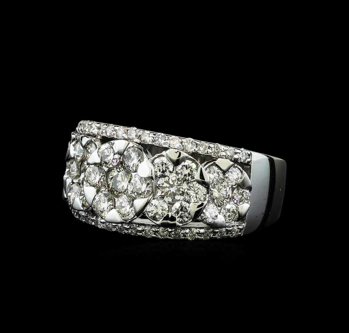 One electronically tested 14KT white gold lady's combination cast & assembled fashion ring with a wide band tapered shank with a bright polish finish. The featured ladies ring has a shank measuring 3.85 millimeters in width. Identified with markings of 'K14'. Condition is new, good workmanship. Containing: Three prong set round brilliant cut diamonds, measuring 3.20 - 3.00 x 1.89mm (depth est.) approximate total weight of 3 Stones = 0.35ct. Graded in the setting. Clarity SI-1 to SI-2. Color: H - I Cut Very Good Six prong set round brilliant cut diamonds, measuring 2.45 - 2.40 x 1.48mm (depth est.) approximate total weight of 6 Stones = 0.31ct. Graded in the setting. Clarity SI-1 to I-1. Color: H - I Cut Good Twenty-Two prong set round brilliant cut diamonds, measuring 2.10 - 2.00 x 1.26mm (depth est.) approximate total weight of 22 Stones = 0.74ct. Graded in the setting. Clarity SI-1 to SI-2. Color: H - I Cut Good Thirty-Four prong set round brilliant cut diamonds, measuring 1.40 - 1.30 x 0.82mm (depth est.) approximate total weight of 34 Stones = 0.27ct. Graded in the setting. Clarity SI-1 to I-1. Color: H - I Cut Good. Total Weight of Diamonds 1.67ct.. Total Weight of Ring 6.70gm GAS Appraised at $5,240.00.