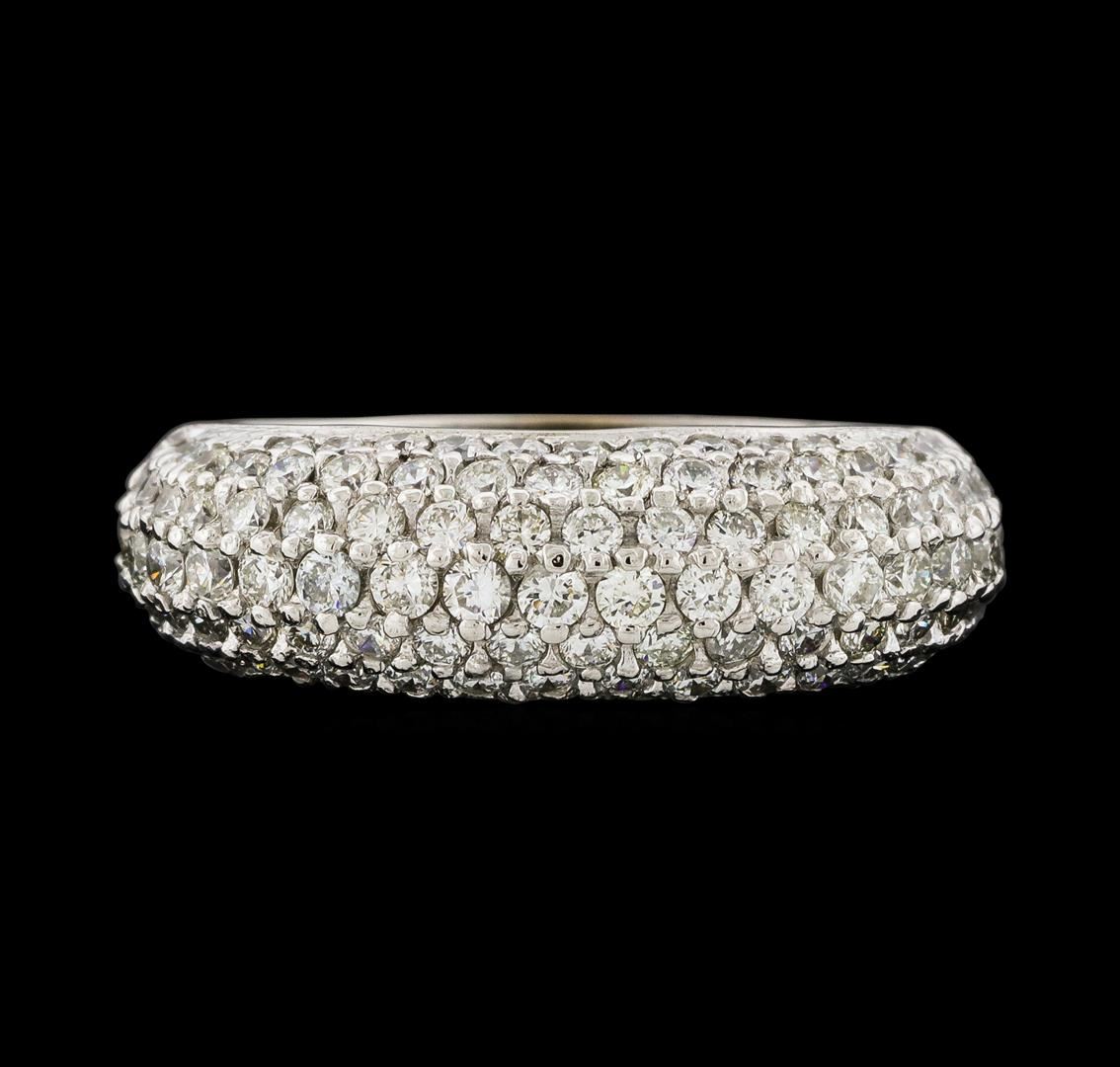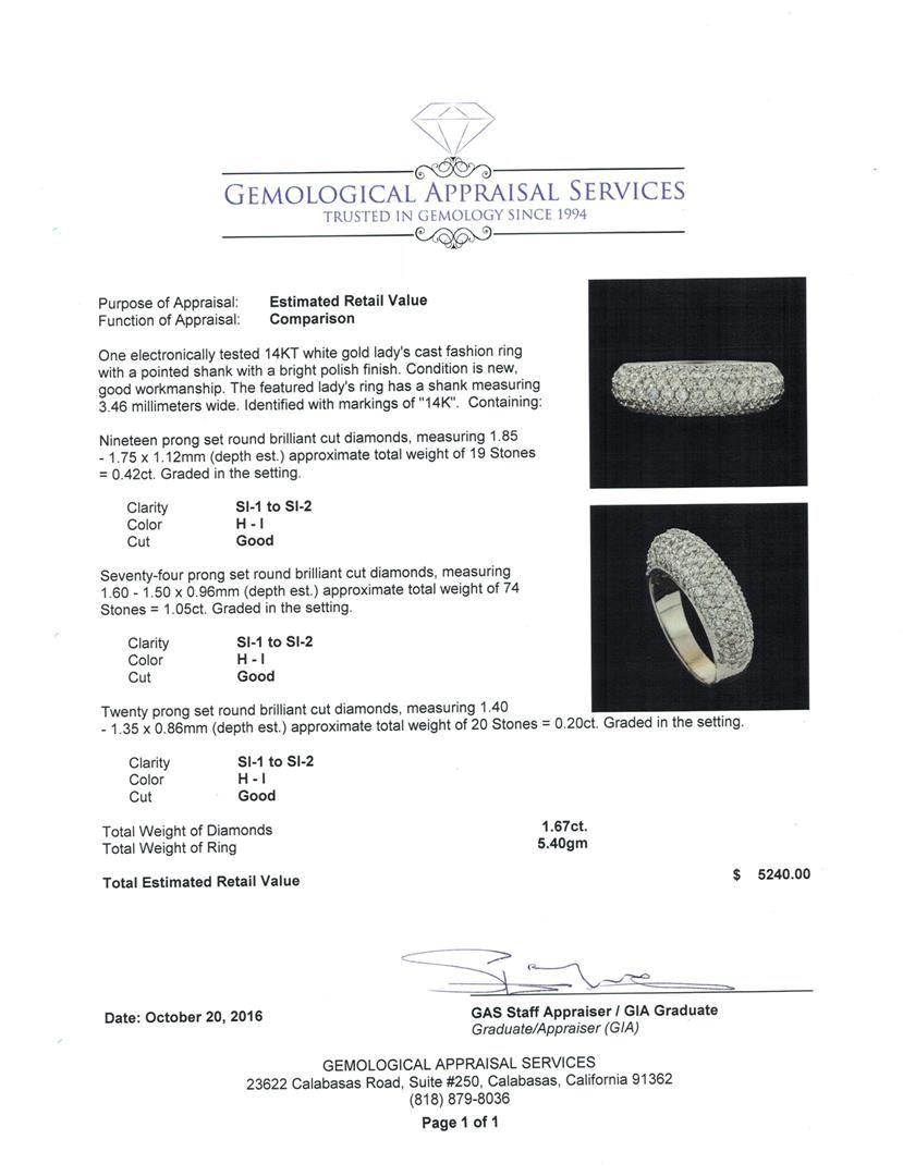 One electronically tested 14KT white gold lady's cast fashion ring with a pointed shank with a bright polish finish. The featured lady's ring has a shank measuring 3.46 millimeters wide. Identified with markings of '14K'. Condition is new, good workmanship. Containing: Nineteen prong set round brilliant cut diamonds, measuring 1.85 - 1.75 x 1.12mm (depth est.) approximate total weight of 19 Stones = 0.42ct. Graded in the setting. Clarity SI-1 to SI-2. Color: H - I Cut Good Seventy-Four prong set round brilliant cut diamonds, measuring 1.60 - 1.50 x 0.96mm (depth est.) approximate total weight of 74 Stones = 1.05ct. Graded in the setting. Clarity SI-1 to SI-2. Color: H - I Cut Good Twenty prong set round brilliant cut diamonds, measuring 1.40 - 1.35 x 0.86mm (depth est.) approximate total weight of 20 Stones = 0.20ct. Graded in the setting. Clarity SI-1 to SI-2. Color: H - I Cut Good. Total Weight of Diamonds 1.67ct.. Total Weight of Ring 5.40gm. GAS Appraised at $5,240.00.