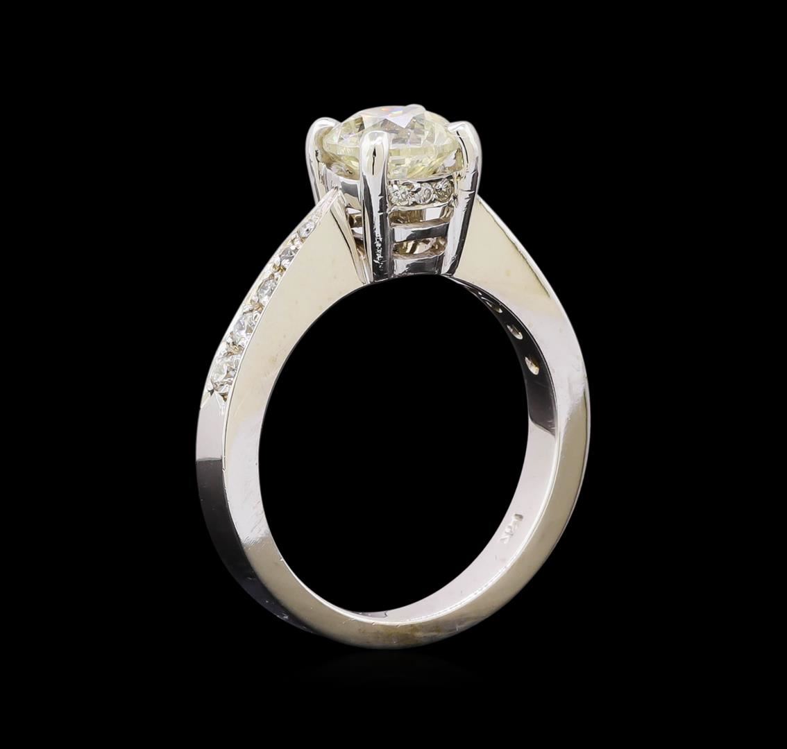 One electronically tested 14KT white gold lady's cast wedding ring with a cathedral shank with a bright polish finish. Featured lady's ring has a shank measuring 3.00 millimeters in width. Identified with markings of "14K". Condition is new, good workmanship. Containing: One prong set round brilliant cut diamond, measuring 6.94 - 6.90 x 5.10mm (depth est.) approximate weight of 1.47ct. Graded in the setting. Clarity: I-1. Color: J. Cut Very Good Six prong set round brilliant cut diamonds, measuring 2.00 - 1.70 x 1.15mm (depth est.) approximate total weight of 6 Stones = 0.14ct. Graded in the setting. Clarity: SI-1 to SI-2. Color: G - Good Ten prong set round brilliant cut diamonds, measuring 1.30 - 1.20 x 0.75mm (depth est.) approximate total weight of 10 Stones = 0.06ct. Graded in the setting. Clarity: SI-1 to SI-2. Color: H - I. Cut Good. Total Weight of Diamonds 1.67ct. Total Weight of Ring 5.60gm. GAS Appraised at $13,670.00.