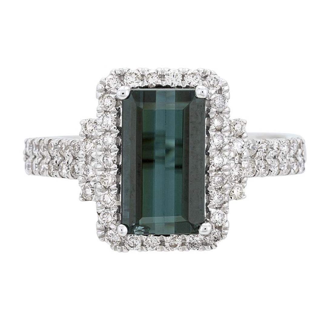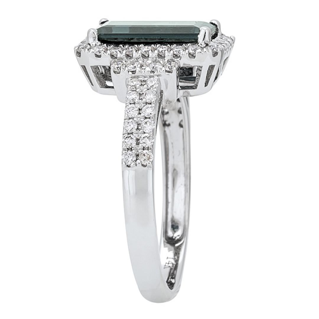 One Indigo and Diamond Ring featuring: 14KT White Gold with a total weight of 3.27 grams, Indigo with a total weight of 1.67ct, and 58 Round Cut Diamonds with a total weight of 0.48ctw.