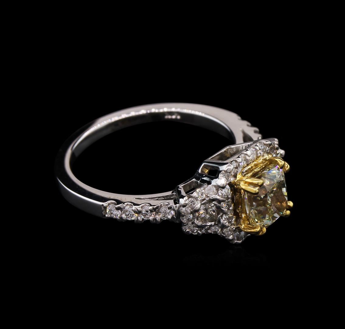 One electronically tested 14KT white gold ladies cast diamond ring with a bright polish finish. The featured diamond is set within an inner yellow gold basket and an outer diamond bezel supported by diamond set shoulders, completed by a one and one-half millimeter wide band. Identified with markings of "14K". Condition is new, good workmanship. Containing: One prong set cushion cut diamond, measuring 5.65 x 5.10 x 3.66mm, 15.00.%. GTCF exact weight 1.13ct with a medium blue fluorescence. Graded in the setting. Clarity: VS-1. Depth: 71.8%. Table 60.8%. Forty-Eight prong set round brilliant & baguette cut diamonds exact total weight 48 Stones = 0.54ct. Graded in the setting. Clarity: SI-1 to I-1. Color: G - I. Total Weight of Diamonds 1.67ct. Total Weight of Ring 4.69gm. AIG Appraised at $9,030.00.