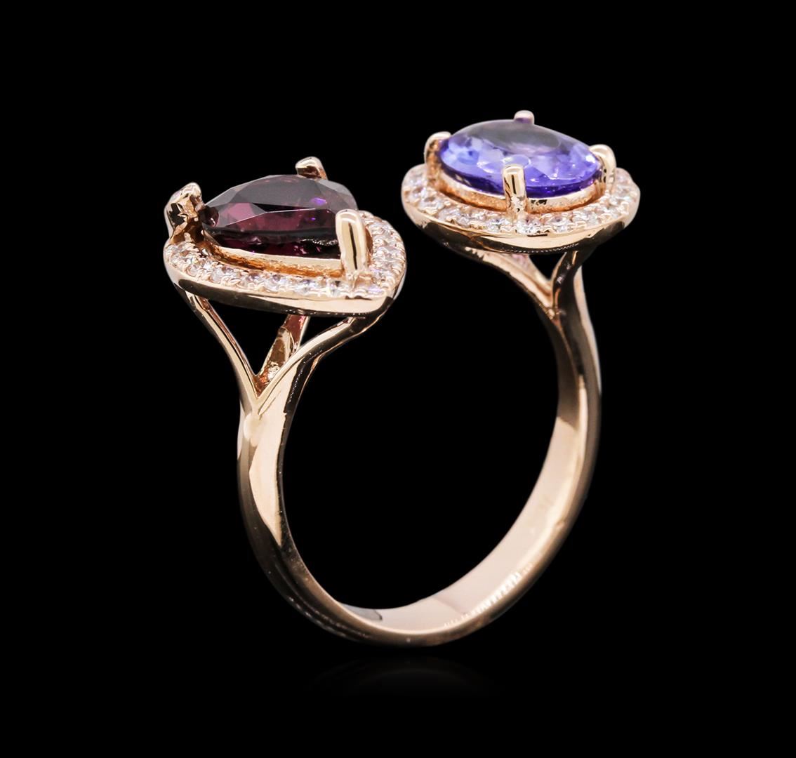 One ring featuring: 14KT white gold weighing 4.41 grams containing one pink tourmaline with a total weight of 1.67ct, one tanzanite with a total weight of 1.40 ct, and diamonds with a total weight of 0.45ct.