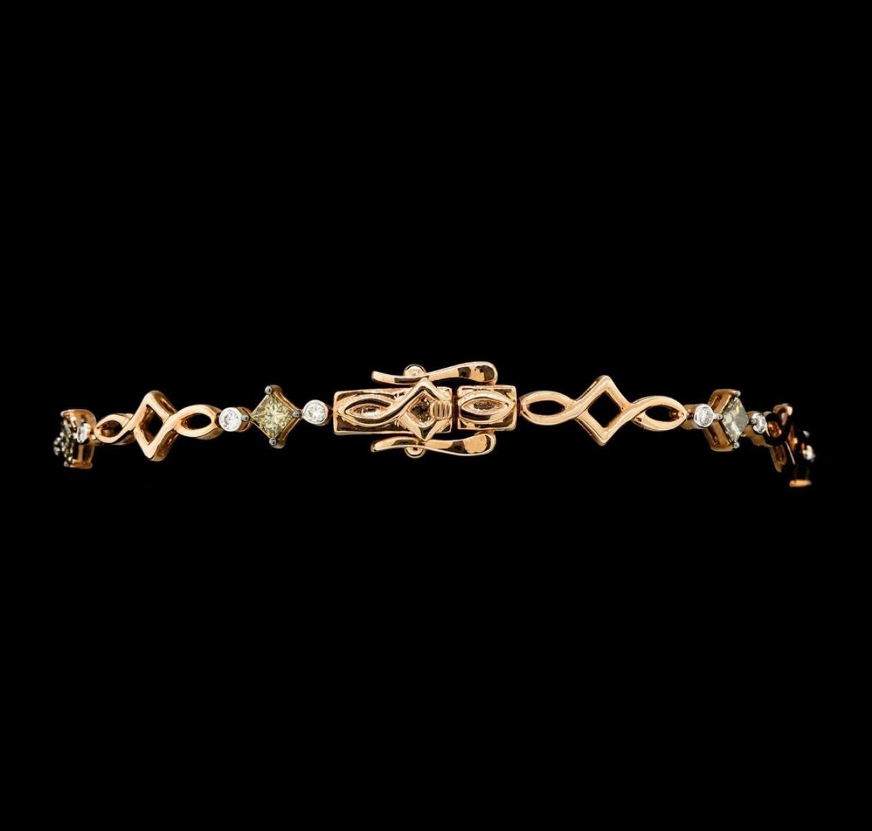 One electronically tested 14KT rose gold lady's combination cast & assembled fashion bracelet with a tongue clasp with double foldover safeties with a bright polish finish. The featured lady's bracelet measures approximately 7.5 inches in length. Identified with markings of '14K'. Condition is new, good workmanship. Containing: Seven prong set princess cut diamonds, measuring 3.30 x 3.00 x 2.25mm (depth est.) approximate total weight of 7 Stones = 1.38ct. Colored gemstones are presumed to have been subjected to commonly used enhancement processes. Graded in the setting. Color Fancy Light Brownish Greenish Yellow Clarity VS-2 to SI-2 Cut Good Fourteen bezel set round brilliant cut diamonds, measuring 1.80 - 1.70 x 1.09mm (depth est.) approximate total weight of 14 Stones = 0.29ct. Graded in the setting. Color H - I Clarity SI-1 to SI-2 Cut Very Good. Total Weight of Diamonds 1.67ct.. Total Weight of Bracelet 8.70gm GAS Appraised at $4215.00. GAS Appraised.