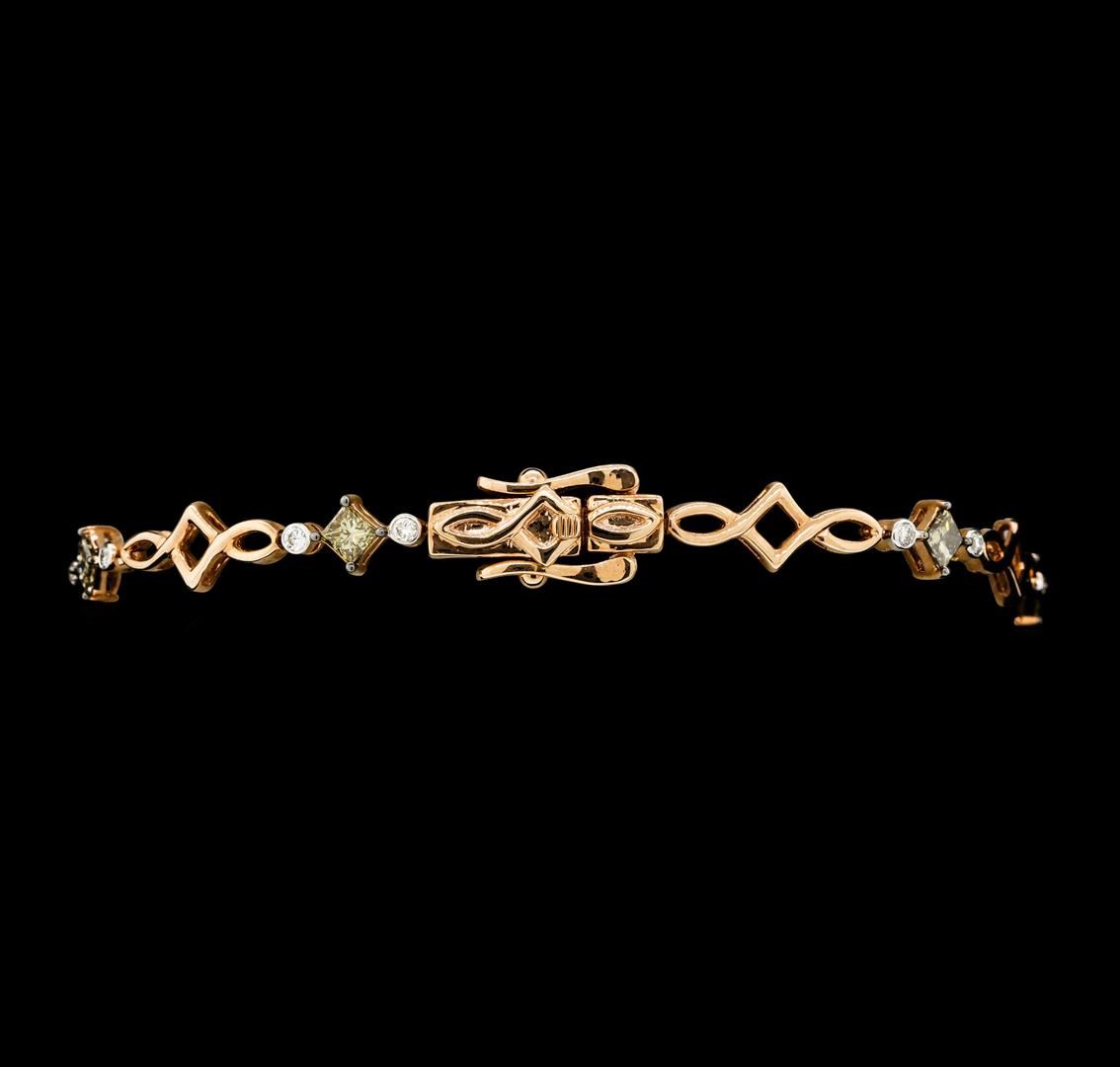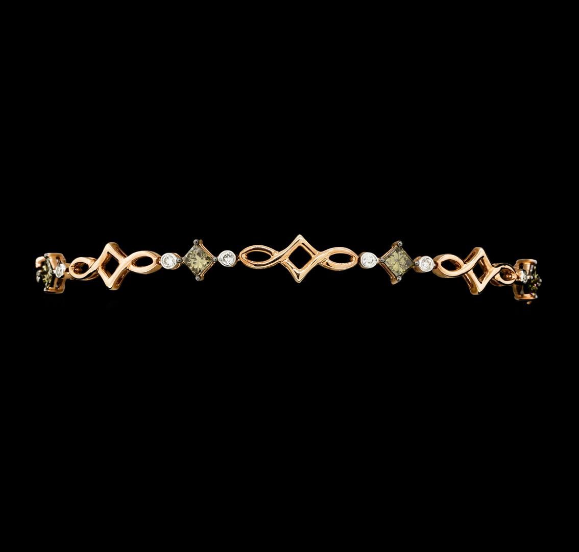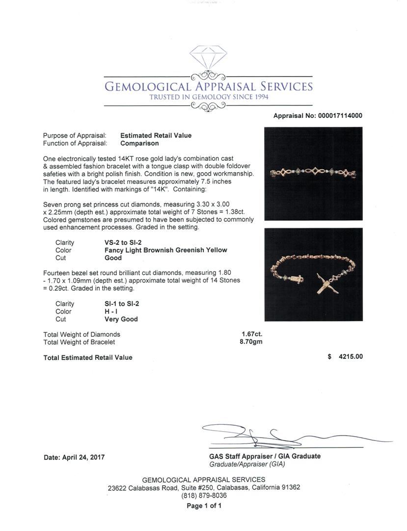 One electronically tested 14KT rose gold lady's combination cast & assembled fashion bracelet with a tongue clasp with double foldover safeties with a bright polish finish. The featured lady's bracelet measures approximately 7.5 inches in length. Identified with markings of '14K'. Condition is new, good workmanship. Containing: Seven prong set princess cut diamonds, measuring 3.30 x 3.00 x 2.25mm (depth est.) approximate total weight of 7 Stones = 1.38ct. Colored gemstones are presumed to have been subjected to commonly used enhancement processes. Graded in the setting. Color Fancy Light Brownish Greenish Yellow Clarity VS-2 to SI-2 Cut Good Fourteen bezel set round brilliant cut diamonds, measuring 1.80 - 1.70 x 1.09mm (depth est.) approximate total weight of 14 Stones = 0.29ct. Graded in the setting. Color H - I Clarity SI-1 to SI-2 Cut Very Good. Total Weight of Diamonds 1.67ct.. Total Weight of Bracelet 8.70gm GAS Appraised at $4215.00. GAS Appraised.