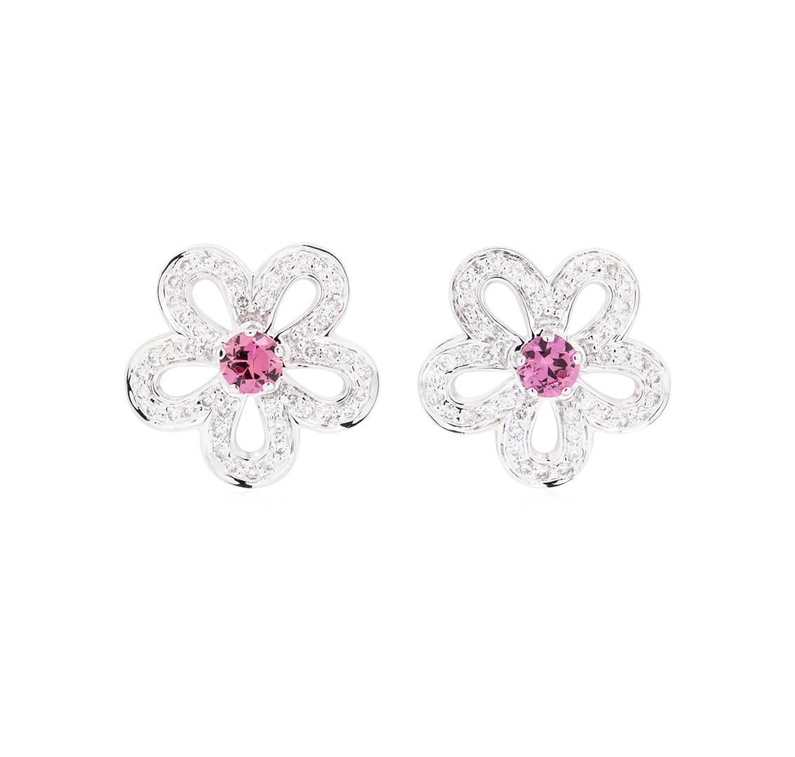 One pair electronically tested 14KT white gold lady's combination cast & assembled fashion floral design earrings with heavy friction backs with a bright polish finish. Identified with markings of '14K'. Condition is new, good workmanship. Containing: Two prong set round modified mixed cut natural pink sapphires, measuring 4.58 - 4.53 x 2.74 mm, (depth est.) approximate total weight of 0.80ct., clarity is eye clean, medium, strong, strongly purplish red color, (GIA stpR 5/5), cut is very good. Transmitting light with no distortion, transparent. Colored gemstones are presumed to have been subjected to commonly used enhancement processes. Graded in the setting. Ninety prong set round brilliant cut diamonds, measuring 1.40 - 1.30 x 0.84mm (depth est.) approximate total weight of 90 Stones = 0.87ct. Graded in the setting. Color H - I Clarity SI-1 to SI-2 Cut Good. Total Weight of Colored Stones 0.80ct.. Total Weight of Diamonds 0.87ct.. Total Weight of Earrings 5.50gm GAS Appraised at $4730.00. GAS Appraised.