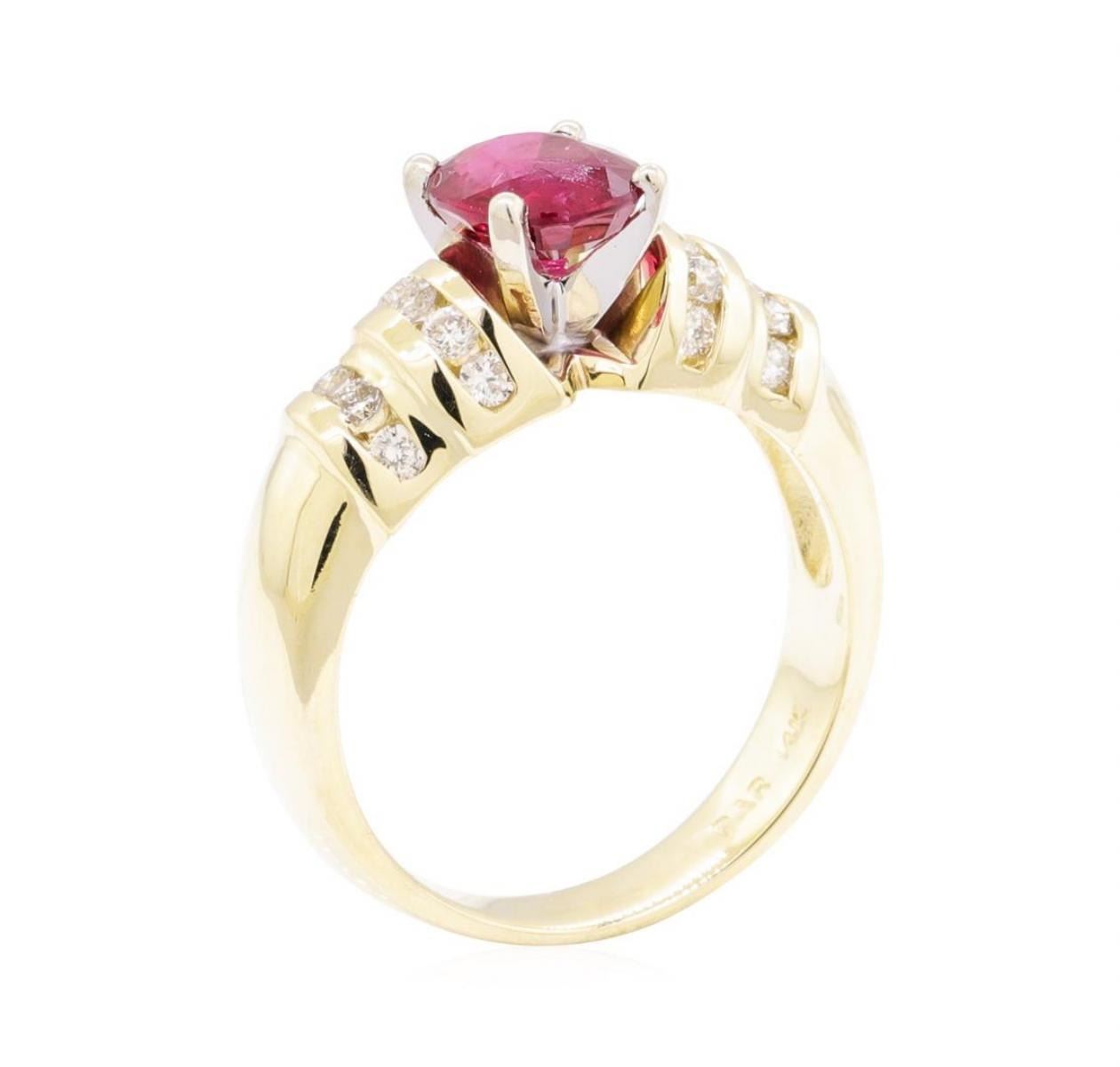 One electronically tested 14KT yellow gold lady's combination cast & assembled fashion ring with a half dome cathedral shank with a bright polish finish. The featured lady's ring has a shank measuring 3.40 millimeters wide. Identified with markings of '14K'. Condition is new, good workmanship. Containing: One prong set oval modified mixed cut natural ruby, measuring 7.04 x 6.18 x 3.30mm, (depth est.) approximate weight of 1.35ct., clarity is moderately included, medium dark, very slightly brownish, slightly purplish red color, (GIA slpR 6/3), cut is very good. Transmitting light somewhat diffusely, transparent to translucent. Colored gemstones are presumed to have been subjected to commonly used enhancement processes. Graded in the setting. Eighteen channel set round brilliant cut diamonds, measuring 1.70 - 1.65 x 1.04mm (depth est.) approximate total weight of 18 Stones = 0.32ct. Graded in the setting. Color G - I Clarity SI-1 to SI-2 Cut Very Good. Total Weight of Colored Stones 1.35ct.. Total Weight of Diamonds 0.32ct.. Total Weight of Ring 5.80gm GAS Appraised at $3805.00. GAS Appraised.