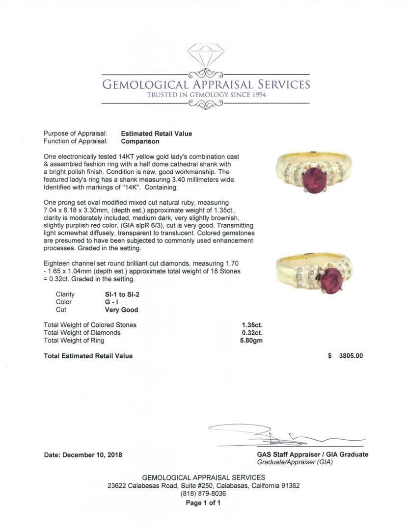 One electronically tested 14KT yellow gold lady's combination cast & assembled fashion ring with a half dome cathedral shank with a bright polish finish. The featured lady's ring has a shank measuring 3.40 millimeters wide. Identified with markings of '14K'. Condition is new, good workmanship. Containing: One prong set oval modified mixed cut natural ruby, measuring 7.04 x 6.18 x 3.30mm, (depth est.) approximate weight of 1.35ct., clarity is moderately included, medium dark, very slightly brownish, slightly purplish red color, (GIA slpR 6/3), cut is very good. Transmitting light somewhat diffusely, transparent to translucent. Colored gemstones are presumed to have been subjected to commonly used enhancement processes. Graded in the setting. Eighteen channel set round brilliant cut diamonds, measuring 1.70 - 1.65 x 1.04mm (depth est.) approximate total weight of 18 Stones = 0.32ct. Graded in the setting. Color G - I Clarity SI-1 to SI-2 Cut Very Good. Total Weight of Colored Stones 1.35ct.. Total Weight of Diamonds 0.32ct.. Total Weight of Ring 5.80gm GAS Appraised at $3805.00. GAS Appraised.