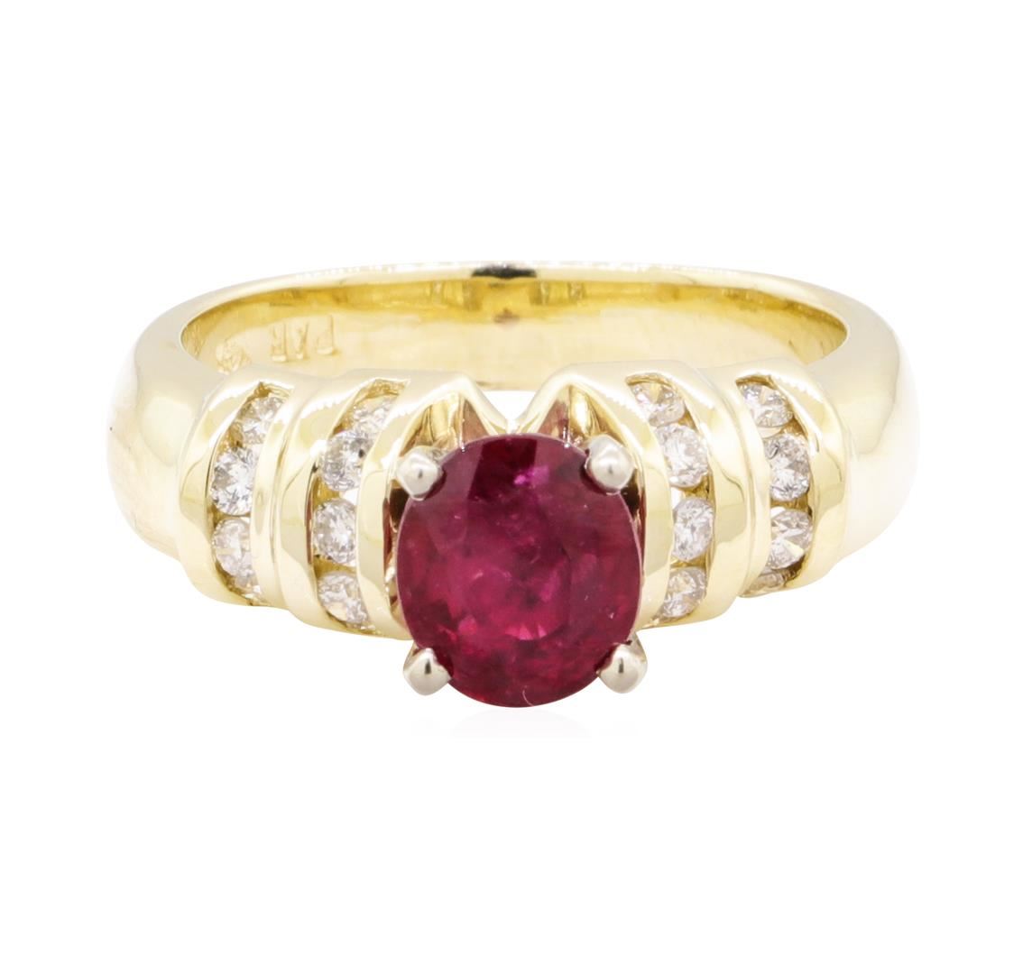 One electronically tested 14KT yellow gold lady's combination cast & assembled fashion ring with a half dome cathedral shank with a bright polish finish. The featured lady's ring has a shank measuring 3.40 millimeters wide. Identified with markings of '14K'. Condition is new, good workmanship. Containing: One prong set oval modified mixed cut natural ruby, measuring 7.04 x 6.18 x 3.30mm, (depth est.) approximate weight of 1.35ct., clarity is moderately included, medium dark, very slightly brownish, slightly purplish red color, (GIA slpR 6/3), cut is very good. Transmitting light somewhat diffusely, transparent to translucent. Colored gemstones are presumed to have been subjected to commonly used enhancement processes. Graded in the setting. Eighteen channel set round brilliant cut diamonds, measuring 1.70 - 1.65 x 1.04mm (depth est.) approximate total weight of 18 Stones = 0.32ct. Graded in the setting. Color G - I Clarity SI-1 to SI-2 Cut Very Good. Total Weight of Colored Stones 1.35ct.. Total Weight of Diamonds 0.32ct.. Total Weight of Ring 5.80gm GAS Appraised at $3805.00. GAS Appraised.