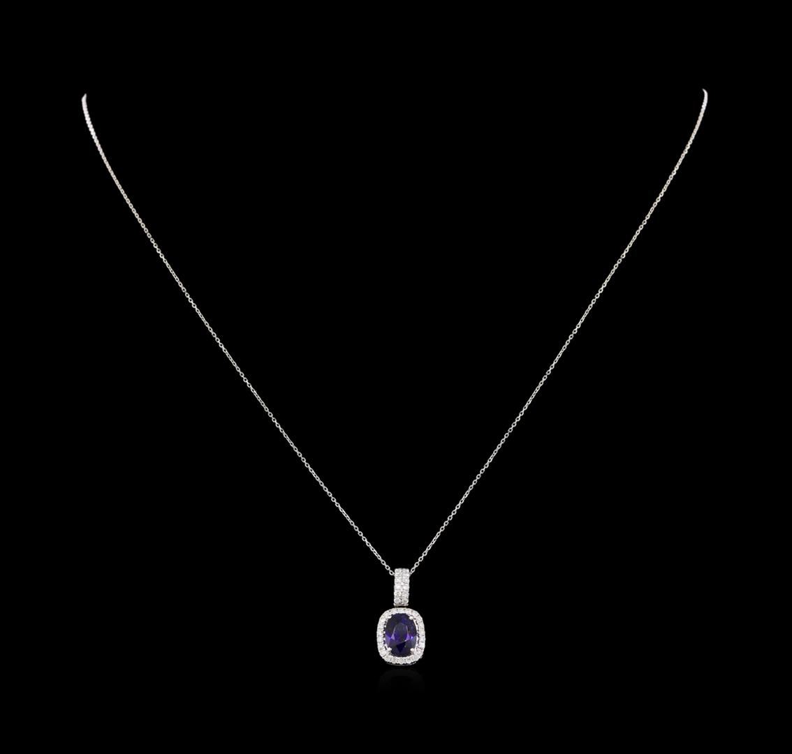 One electronically tested 14KT white gold ladies cast & assembled sapphire and diamond pendant with chain. The pendant features a sapphire set within a diamond bezel, completed by a diamond set bail. The pendant is supported by an eighteen inch length 14KT white gold designer style chain, terminating in a spring ring clasp. Bright polish finish. Trademark is Orianne. Identified with markings of "14K". Condition is new, good workmanship. Containing: One prong set oval mixed cut natural blue sapphire, measuring 8.00 x 5.90 x 3.90mm, 10%. bulge factor, approximate weight of 1.67ct., clarity is moderately included, type II, dark, moderately strong, blue color, (GIA B 7/4), cut is good. Transmitting light with a minimum of distortion, transparent. Naturally occurring internal & external characteristics are present. Indications of laboratory high temperature diffusion treatment. Graded in the setting. Thirty-Four prong set round brilliant cut diamonds approximate total weight of 34 Stones = 0.29ct. Graded in the setting. Clarity: I-1 to I-2. Color: G - H. Total Weight of Colored Stones 1.67ct. Total Weight of Diamonds 0.29ct. Total Weight of Pendant With Chain 2.56gm. AIG Appraised at $1,825.00.
