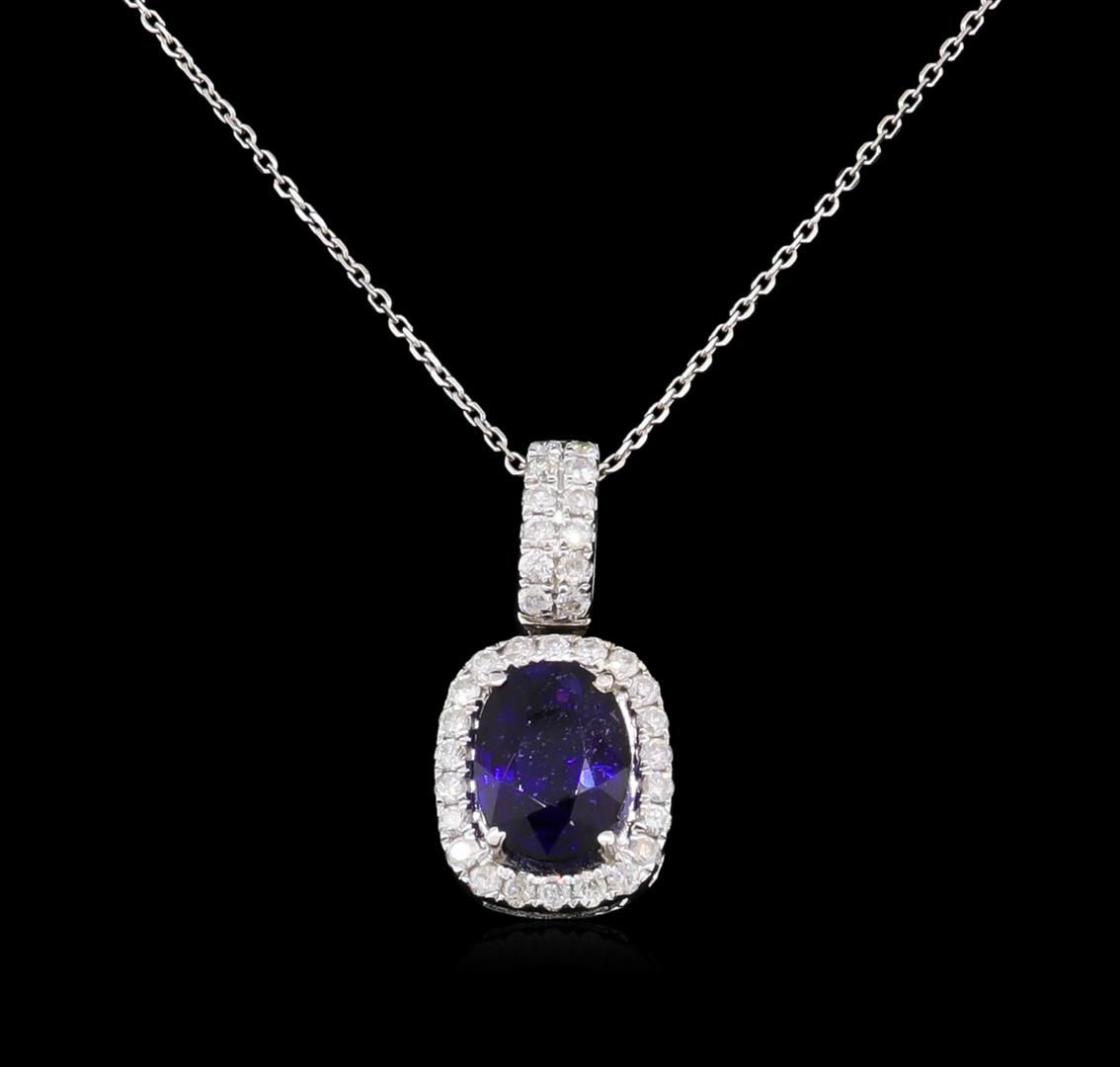 One electronically tested 14KT white gold ladies cast & assembled sapphire and diamond pendant with chain. The pendant features a sapphire set within a diamond bezel, completed by a diamond set bail. The pendant is supported by an eighteen inch length 14KT white gold designer style chain, terminating in a spring ring clasp. Bright polish finish. Trademark is Orianne. Identified with markings of "14K". Condition is new, good workmanship. Containing: One prong set oval mixed cut natural blue sapphire, measuring 8.00 x 5.90 x 3.90mm, 10%. bulge factor, approximate weight of 1.67ct., clarity is moderately included, type II, dark, moderately strong, blue color, (GIA B 7/4), cut is good. Transmitting light with a minimum of distortion, transparent. Naturally occurring internal & external characteristics are present. Indications of laboratory high temperature diffusion treatment. Graded in the setting. Thirty-Four prong set round brilliant cut diamonds approximate total weight of 34 Stones = 0.29ct. Graded in the setting. Clarity: I-1 to I-2. Color: G - H. Total Weight of Colored Stones 1.67ct. Total Weight of Diamonds 0.29ct. Total Weight of Pendant With Chain 2.56gm. AIG Appraised at $1,825.00.