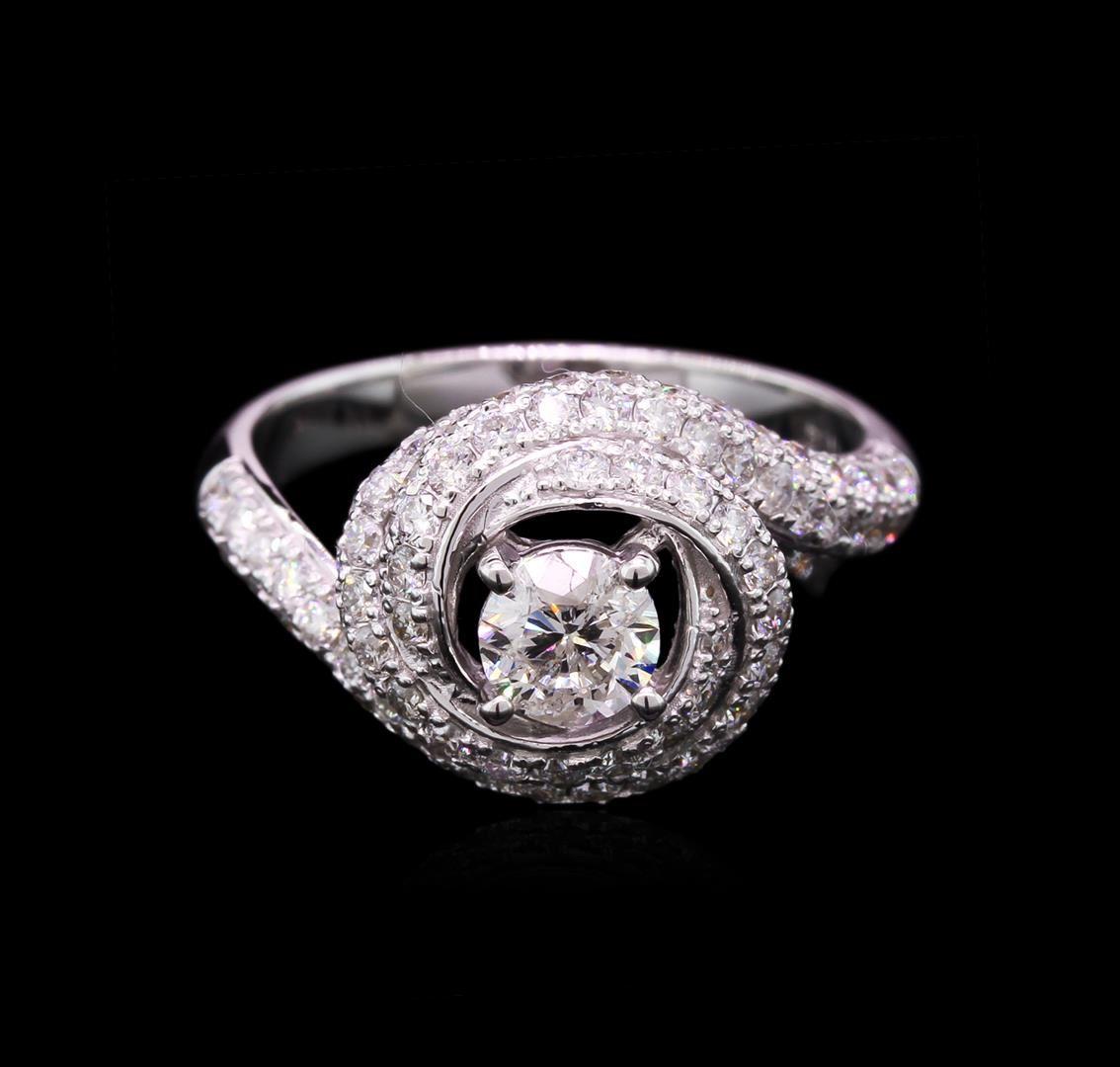 One electronically tested 14KT white gold lady's cast wedding ring with a spiral halo with a bright polish finish. The featured lady's ring has a shank measuring 2.47 millimeters wide. Identified with markings of "K14". Condition is new, good workmanship. Containing: One prong set round brilliant cut diamond, measuring 4.88 - 4.87 x 3.21mm (depth est.) , 5.00% GTCF approximate weight of 0.52ct. Graded in the setting. Clarity: I-1. Color: I. Cut Good Ninety-Two prong set round brilliant cut diamonds, measuring 1.50 - 1.40 x 0.94mm (depth est.) approximate total weight of 92 Stones = 1.15ct. Graded in the setting. Clarity: SI-1 to SI-2. Color: G - H. Cut Good. Total Weight of Diamonds 1.67ct. Total Weight of Ring 4.60gm. GAS Appraised at $7,325.00.