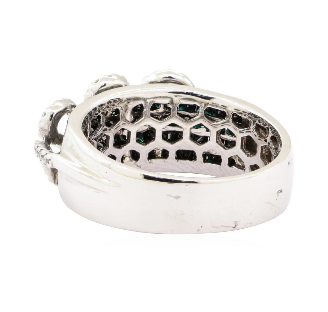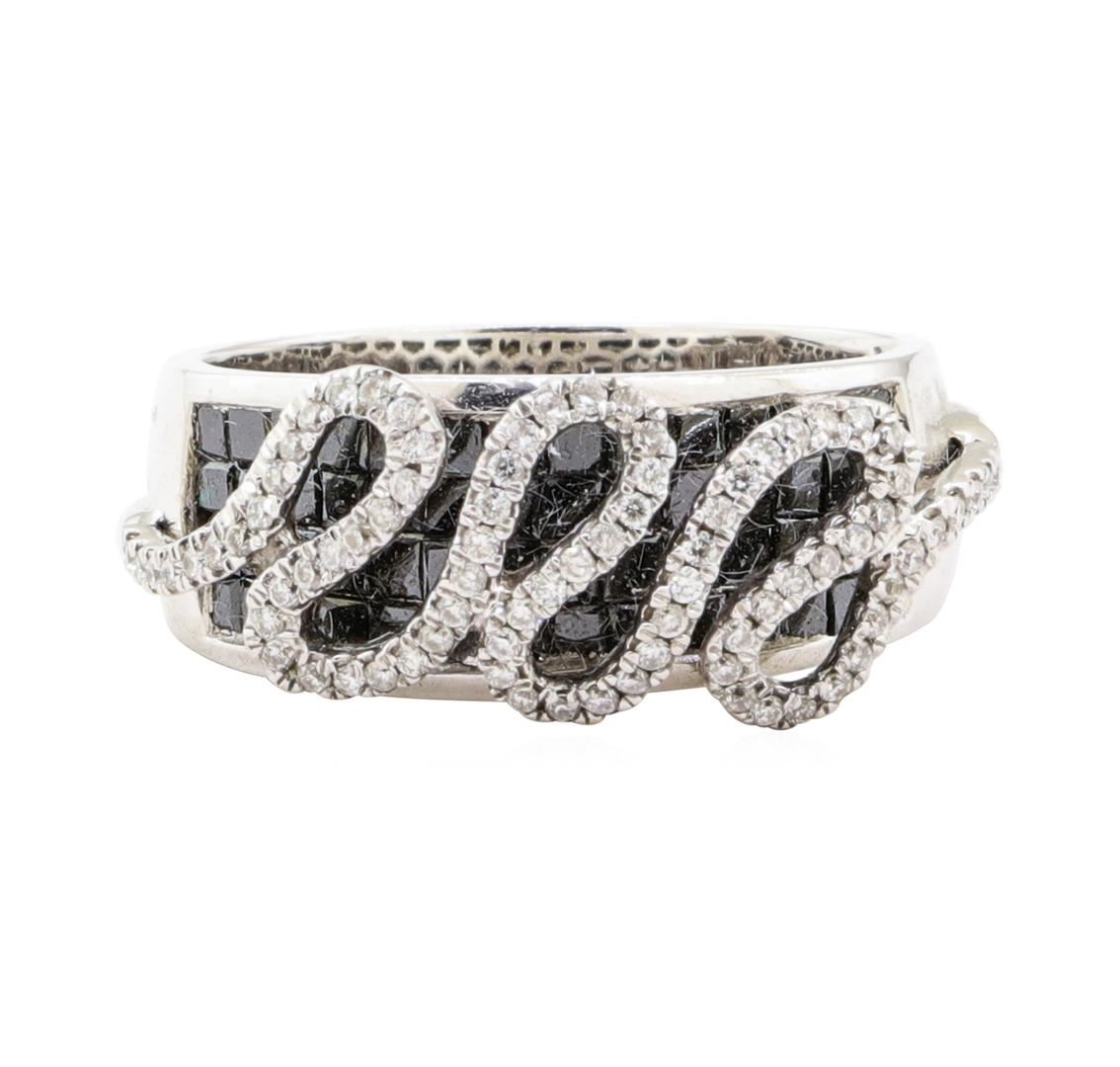 One electronically tested 14KT white gold lady's combination cast & assembled fashion ring with a wide band half dome with a bright polish finish. The featured lady's ring has wave accents and a shank measuring 5.00 millimeters wide. Identified with markings of '14K'. Condition is new, good workmanship. Containing: Fifty-Six invisible set princess cut treated diamonds, measuring 1.80 x 1.50 x 1.13mm (depth est.) approximate total weight of 56 Stones = 1.38ct. Colored gemstones are presumed to have been subjected to commonly used enhancement processes. Graded in the setting. Color Fancy Black Cut Good Eighty-Three prong set round brilliant cut diamonds, measuring 1.00 - 0.95 x 0.61mm (depth est.) approximate total weight of 83 Stones = 0.30ct. Graded in the setting. Color G - H Clarity SI-1 to I-1 Cut Good. Total Weight of Diamonds 1.68ct.. Total Weight of Ring 6.70gm GAS Appraised at $3955.00. GAS Appraised.
