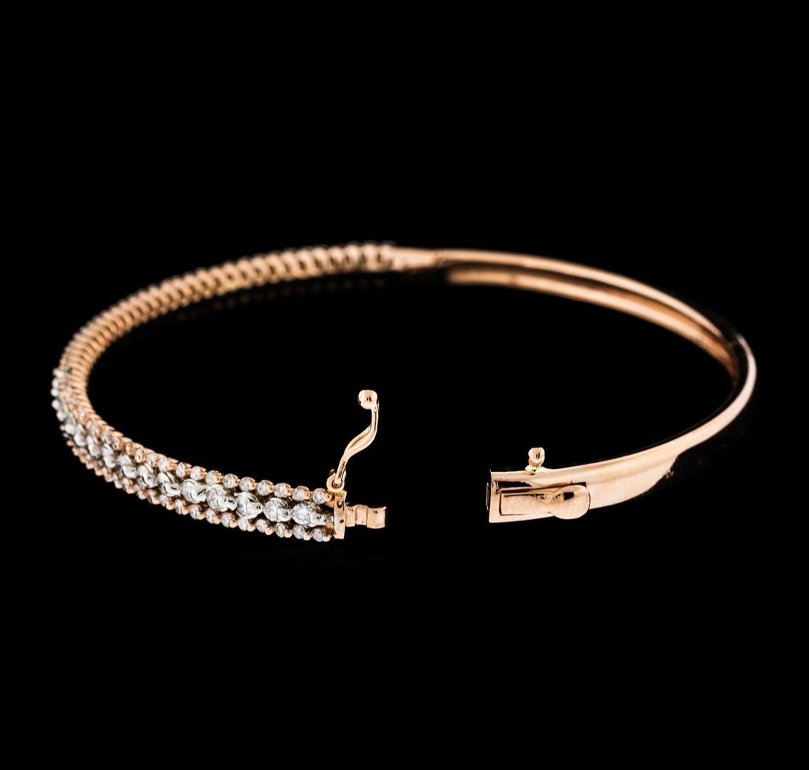 One electronically tested 14KT rose gold lady's combination cast & assembled fashion bangle bracelet with a tongue clasp with foldover safety with a bright polish finish. The featured lady's bracelet measures approximately 7 inches in length. Identified with markings of 'K14'. Condition is new, good workmanship. Containing: Thirty-Three prong set round brilliant cut diamonds, measuring 2.00 - 1.80 x 1.18mm (depth est.) approximate total weight of 33 Stones = 0.90ct. Graded in the setting. Clarity SI-1 to SI-2. Color: H - I Cut Good One Hundred Ten prong set round brilliant cut diamonds, measuring 1.30 - 1.15 x 0.76mm (depth est.) approximate total weight of 110 Stones = 0.78ct. Graded in the setting. Clarity SI-1 to I-1. Color: H - I Cut Good. Total Weight of Diamonds 1.68ct.. Total Weight of Bangle Bracelet 12.10gm. GAS Appraised at $6,705.00.