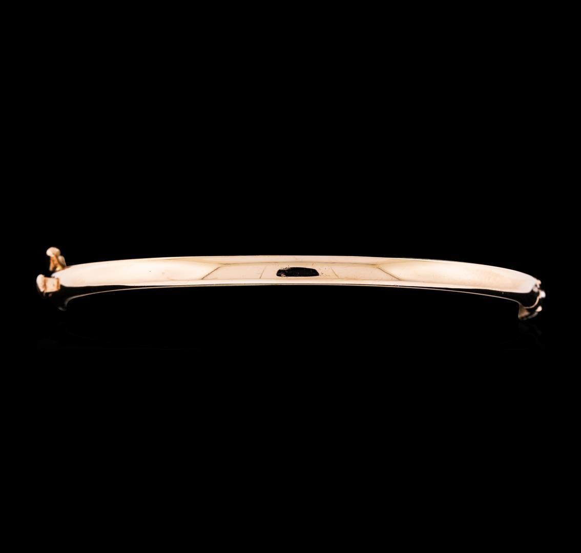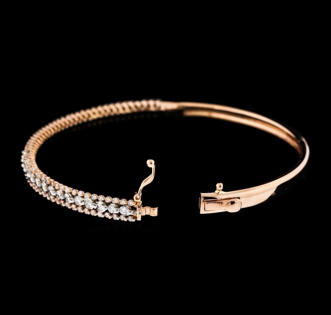 One electronically tested 14KT rose gold lady's combination cast & assembled fashion bangle bracelet with a tongue clasp with foldover safety with a bright polish finish. The featured lady's bracelet measures approximately 7 inches in length. Identified with markings of 'K14'. Condition is new, good workmanship. Containing: Thirty-Three prong set round brilliant cut diamonds, measuring 2.00 - 1.80 x 1.18mm (depth est.) approximate total weight of 33 Stones = 0.90 ct. Graded in the setting. Clarity SI-1 to SI-2. Color: H - I Cut Good One Hundred Ten prong set round brilliant cut diamonds, measuring 1.30 - 1.15 x 0.76mm (depth est.) approximate total weight of 110 Stones = 0.78ct. Graded in the setting. Clarity SI-1 to I-1. Color: H - I Cut Good. Total Weight of Diamonds 1.68ct.. Total Weight of Bangle Bracelet 12.10gm. GAS Appraised.
