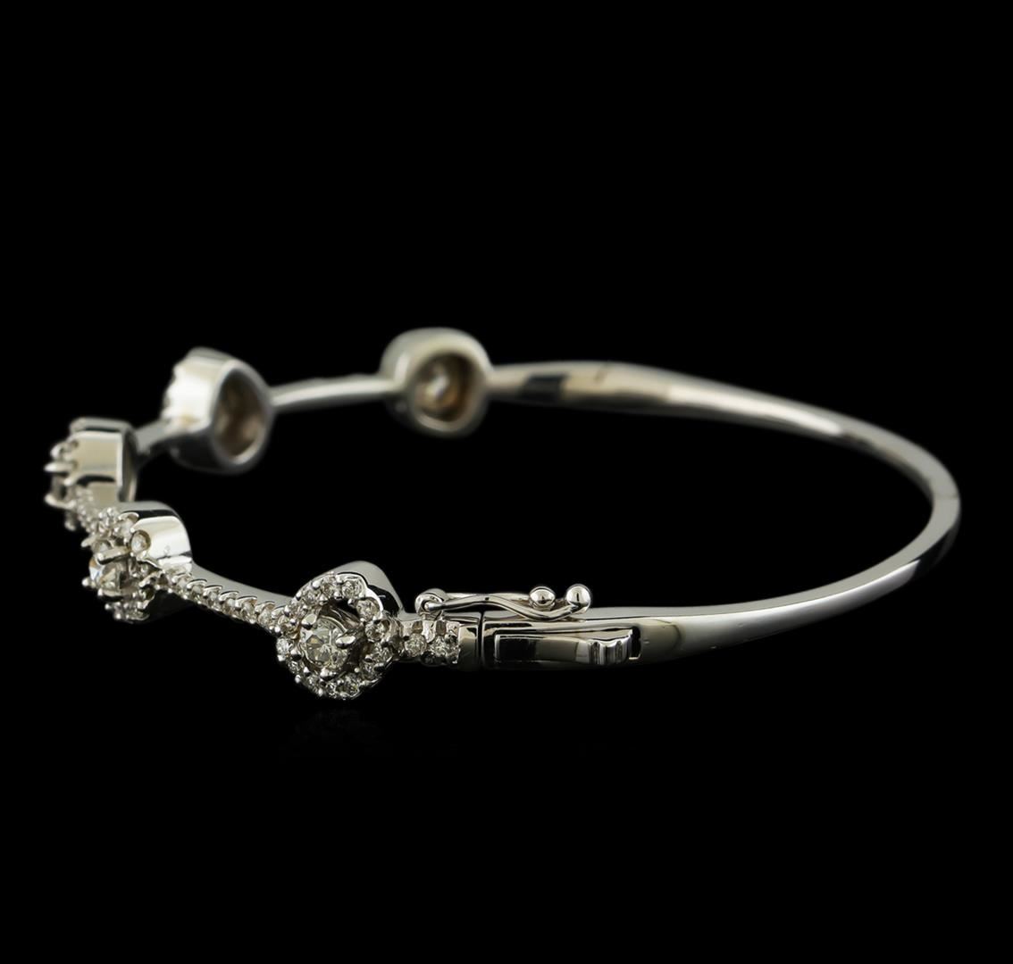 One electronically tested 14KT white gold lady's combination cast & assembled fashion bangle bracelet with a tongue clasp with foldover safety with a bright polish finish. The featured lady's bracelet measures approximately 7.25 inches in circumference. Identified with markings of "K14". Condition is new, good workmanship. Containing: Five prong set round brilliant cut diamonds, measuring 3.40 - 3.30 x 2.04mm (depth est.) approximate total weight of 5 Stones = 0.70ct. Graded in the setting. Clarity: SI-1 to SI-2. Color: H - I. Cut Very Good One Hundred Two prong set round brilliant cut diamonds, measuring 1.40 - 1.30 x 0.84mm (depth est.) approximate total weight of 102 Stones = 0.98ct. Graded in the setting. Clarity: SI-1 to SI-2. Color: H - I. Cut Good. Total Weight of Diamonds 1.68ct. Total Weight of Bangle Bracelet 13.50gm. GAS Appraised at $6,990.00.