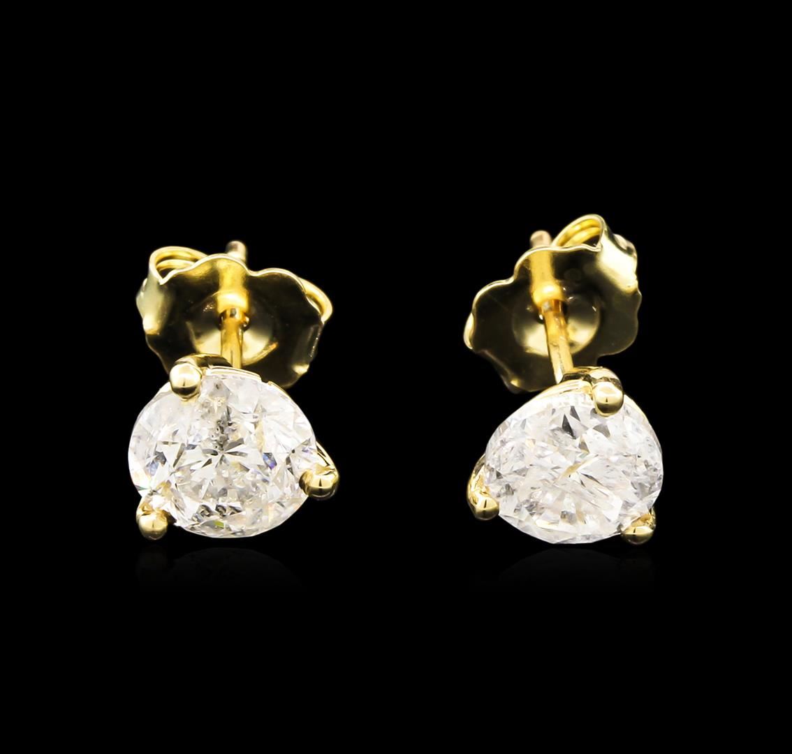One pair electronically tested 14KT yellow gold lady's combination cast & assembled fashion earrings with friction posts with a bright polish finish. The featured pair of lady's earrings has a three prong basket martini setting. Identified with markings of "14K". Condition is new, good workmanship. Containing: Two prong set round brilliant cut diamonds, measuring 6.15 - 5.90 x 3.62mm (depth est.) , 5.00.%. GTCF approximate total weight of 2 Stones = 1.68ct. Graded in the setting. Clarity: I-1 to I-2. Color: G - Good. Total Weight of Diamonds 1.68ct. Total Weight of Earrings 1.20gm. GAS Appraised at $6,440.00.