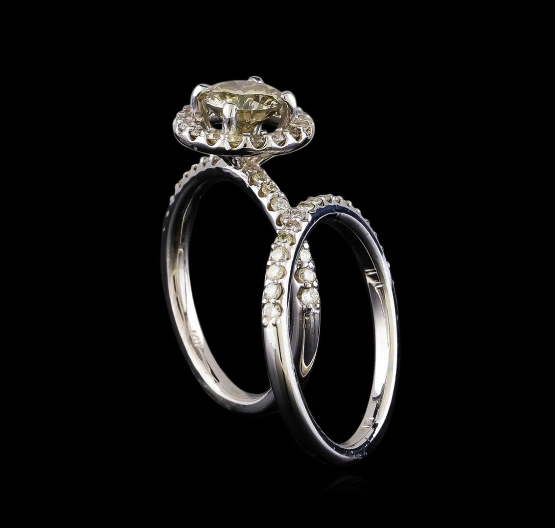 One electronically tested 14KT white gold ladies cast diamond wedding set with a bright polish finish. Condition is new, good workmanship. The wedding set includes a diamond engagement ring and a diamond wedding band. The engagement ring features a round brilliant diamond set within a diamond bezel, supported by diamond set shoulders. The matching wedding band features a diamond ribbon. Each ring is completed by a two millimeter wide band. Identified with markings of "14K". Containing: One prong set round brilliant cut diamond, measuring 6.50 - 6.50 x 3.80mm (depth est.) approximate weight of 1.00ct. Naturally occurring internal & external characteristics are present, including a cloud throughout. Faint secondary color throughout. Graded in the setting: Clarity: SI-1. Color: M. Depth: 58.5%. Table: 61.5%. Polish: Very Good. Symmetry: Very Good. Fifty-three prong set round brilliant cut diamonds, measuring 1.50 -1.50 x 0.90mm (depth est.) approximate total weight of 53 Stones = 0.68ct. Color & clarity grade are an average for the group. Graded in the setting: Clarity: SI-2 to I-1. Color: H-J. Total Weight of Diamonds: 1.68ct. Total Weight of Wedding Set: 5.51 gm. AIG Appraised at $10,130.00.