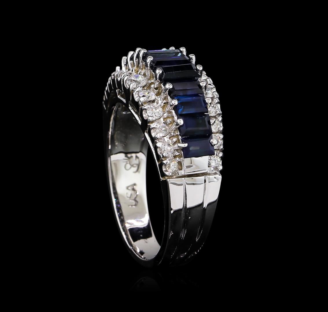 One polished, stamped, and tested 14KT white gold ring mounted with: 11 genuine sapphire center stones weighing 1.68ct, and 22 genuine round diamonds weighing 0.38ct. This item weighs 6.00 grams, condition is new, very good workmanship. AIGL Appraised at $3,550.00.