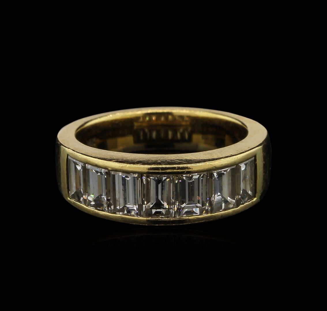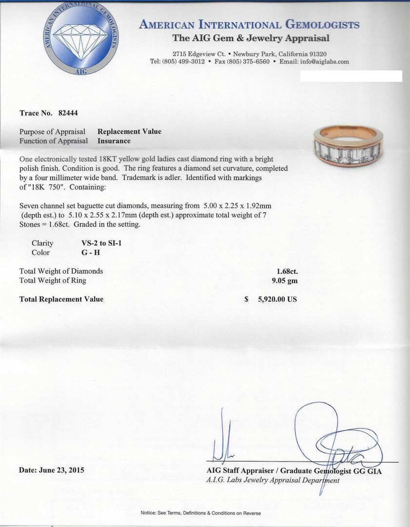 One electronically tested 18KT yellow gold ladies cast diamond ring with a bright polish finish. Condition is good. The ring features a diamond set curvature, completed by a four millimeter wide band. Trademark is adler. Identified with markings of "18K 750". Containing: Seven channel set baguette cut diamonds, measuring from 5.00 x 2.25 x 1.92mm (depth est.) to 5.10 x 2.55 x 2.17mm (depth est.) approximate total weight of 7 Stones = 1.68ct. Graded in the setting. Clarity: VS-2 to SI-1. Color: G - H. Total Weight of Diamonds: 1.68ct. Total Weight of Ring: 9.05 gm. AIG Appraised at $5,920.00.