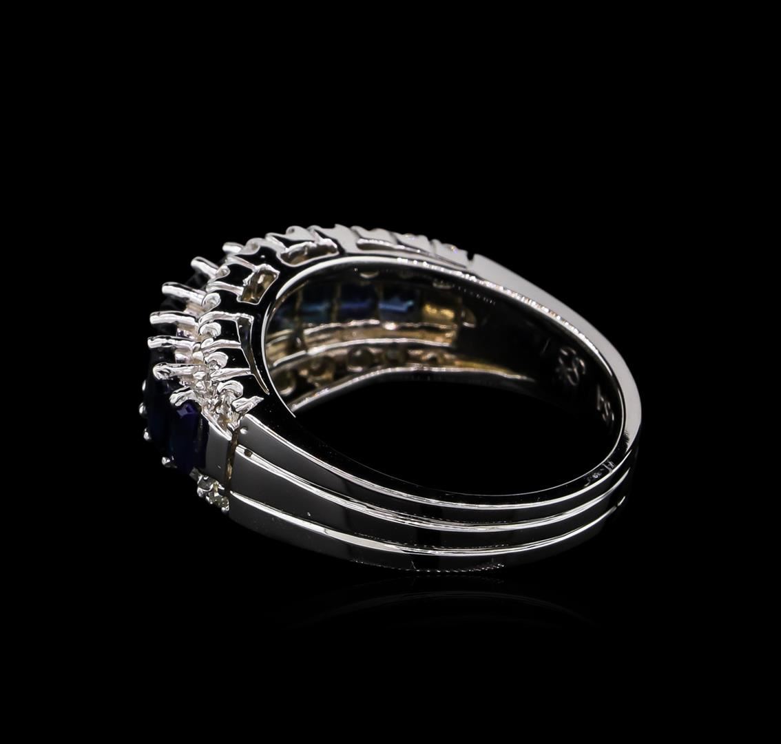 One polished, stamped, and tested 14KT white gold ring mounted with: 11 genuine sapphire center stones weighing 1.68ct, and 22 genuine round diamonds weighing 0.38ct. This item weighs 6.00 grams, condition is new, very good workmanship. AIGL Appraised at $3,550.00.