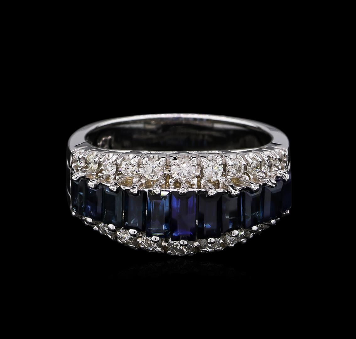 One polished, stamped, and tested 14KT white gold ring mounted with: 11 genuine sapphire center stones weighing 1.68ct, and 22 genuine round diamonds weighing 0.38ct. This item weighs 6.00 grams, condition is new, very good workmanship. AIGL Appraised at $3,550.00.