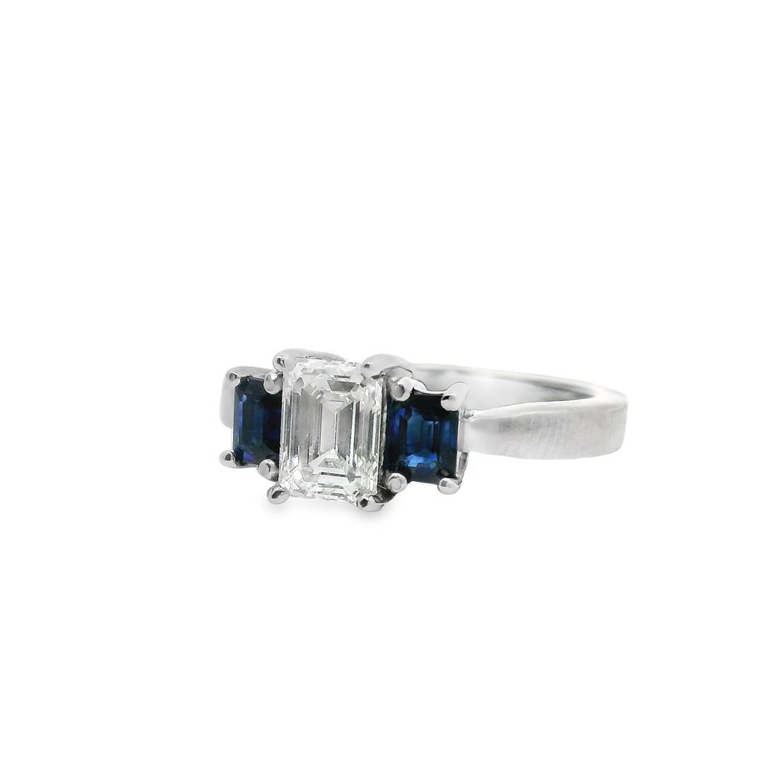 This BEAUTIFUL three-stone ring features a GIA-certified 1.01ct emerald cut diamond with VS-2 clarity, accented by 0.68ct of vibrant natural blue sapphires. A timeless and sophisticated design! One electronically tested 14KT white gold lady's cast fashion three stone ring with a basket motif with a bright polish finish. Condition is new, good workmanship. The featured lady's ring has a shank measuring 2.56 millimeters in width. Identified with markings of 14K. Containing: One prong set emerald cut diamond, measuring 6.62 x 4.93 x 3.26mm (depth est.) approximate weight of 1.01ct. GIA Gem Trade Laboratory Report # 6223035413. Color: I Clarity: VS-2 Cut: Very Good Two prong set emerald step cut natural blue sapphires, measuring 4.20 x 3.10 x 2.40mm (depth est.) approximate total weight of 0.68ct., clarity is eye clean, medium dark, strong, violetish blue color, (GIA vB 6/5), cut is very good. Colored gemstones are presumed to have been subjected to commonly used enhancement processes. Transmitting light with a minimum of distortion, transparent. Graded in the setting. Total Weight of Colored Stones: 0.68ct. Total Weight of Diamonds: 1.01ct. Total Weight of Ring: 5.20gm Total Estimated Retail Value: $11400.00 Appraisal No: 000024088013