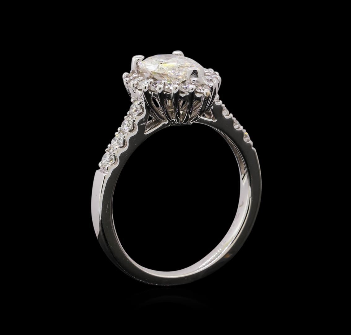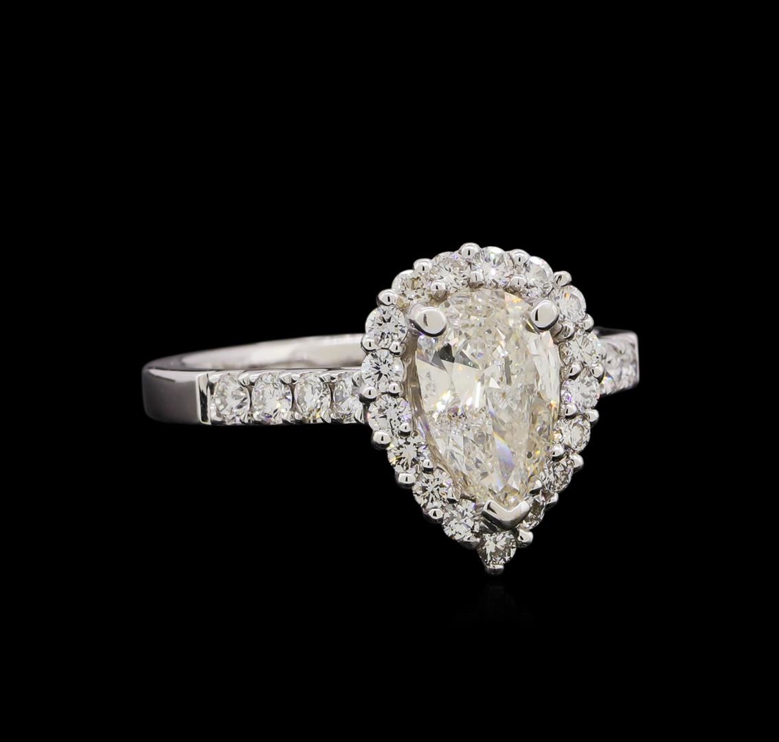One 18KT white gold ring weighing 4.48 grams, featuring one pear shape diamond with SI-3 clarity and I-J color weighing 1.08ct and surrounding diamonds with SI-VS clarity and G-H color weighing 0.61ctw. RBGS Appraised at $9,200.00.