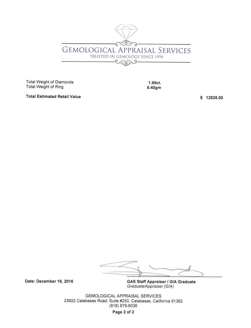 One electronically tested 18KT white gold lady's cast wedding ring with a cathedral European shank with a bright polish with milgrain detailing finish. The featured lady's ring has a shank measuring 3.54 millimeters wide. Identified with markings of '18K'. Condition is new, good workmanship. Containing: One prong set round brilliant cut diamond, measuring 6.15 - 6.10 x 4.16mm (depth est.) , 10.00.%. GTCF approximate weight of 1.08ct. Graded in the setting. Clarity I-1. Color: I - J Cut Good Six channel set baguette cut diamonds, measuring from 3.00 x 1.20 x 1.02mm (depth est.) to 3.60 x 1.30 x 1.11mm (depth est.) approximate total weight of 6 Stones = 0.24ct. Graded in the setting. Clarity VS-1 to VS-2. Color: G - H Cut Very Good Eight prong set round brilliant cut diamonds, measuring 1.70 - 1.60 x 1.02mm (depth est.) approximate total weight of 8 Stones = 0.14ct. Graded in the setting. Clarity SI-1 to SI-2. Color: H - I Cut Good Twenty-Four prong set round brilliant cut diamonds, measuring 1.40 - 1.30 x 0.84mm (depth est.) approximate total weight of 24 Stones = 0.23ct. Graded in the setting. Clarity VS-2 to SI-1. Color: H - I Cut Good. Total Weight of Diamonds 1.69ct.. Total Weight of Ring 6.40gm. GAS Appraised at $12,535.00.
