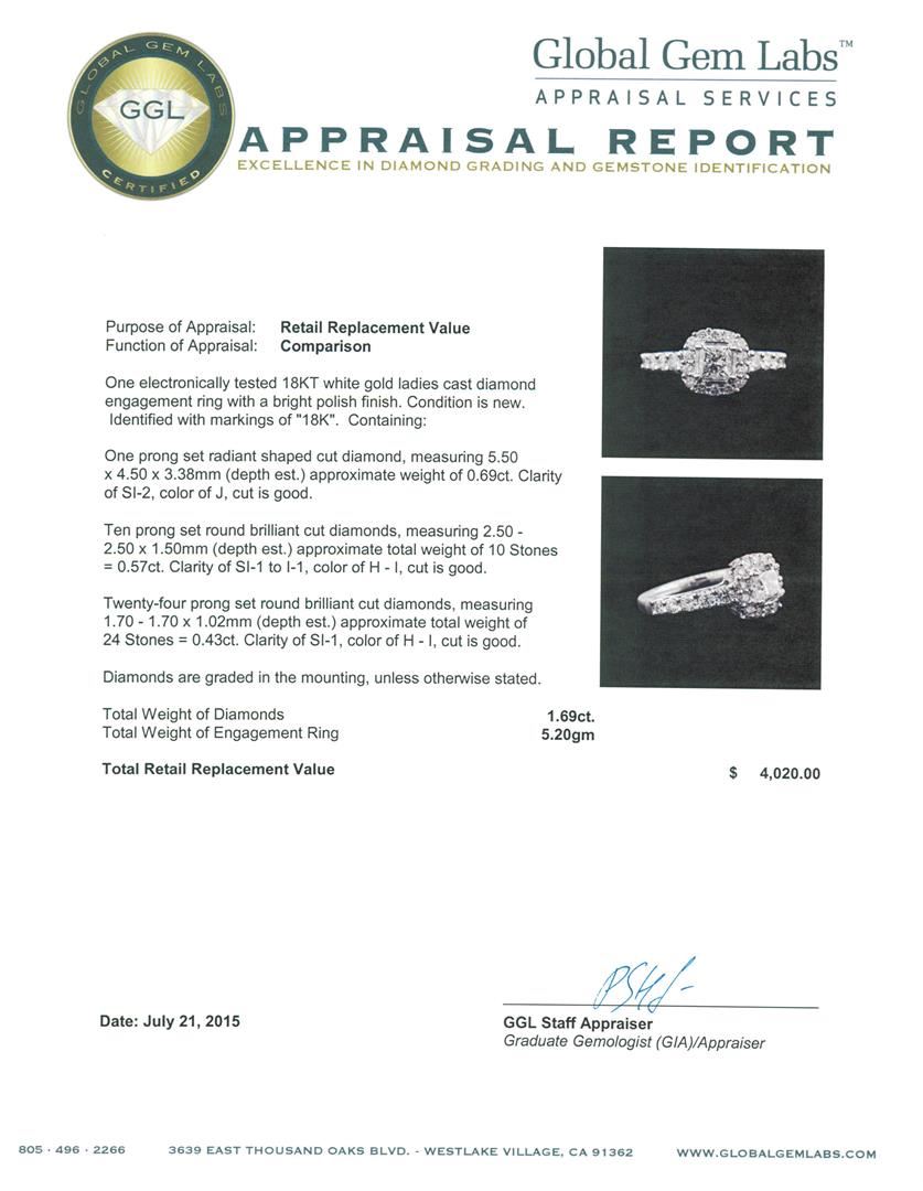 One electronically tested 18KT white gold ladies cast diamond engagement ring with a bright polish finish. Identified with markings of "18K". Condition is new. Containing: One prong set radiant shaped cut diamond, measuring 5.50 x 4.50 x 3.38mm (depth est.) approximate weight of 0.69ct. Clarity: SI-2. Color: J, Cut is Good. Ten prong set round brilliant cut diamonds, measuring 2.50 - 2.50 x 1.50mm (depth est.) approximate total weight of 10 Stones = 0.57ct. Clarity: SI-1 to I-1. Color: H - I, Cut is Good. Twenty-Four prong set round brilliant cut diamonds, measuring 1.70 - 1.70 x 1.02mm (depth est.) approximate total weight of 24 Stones = 0.43ct. Clarity: SI-1. Color: H - I, Cut is Good. Diamonds are graded in the mounting, unless otherwise stated. Total Weight of Diamonds 1.69ct. Total Weight of Engagement Ring 5.20gm. GGL Appraised at $4,020.00.