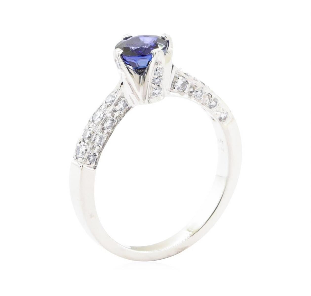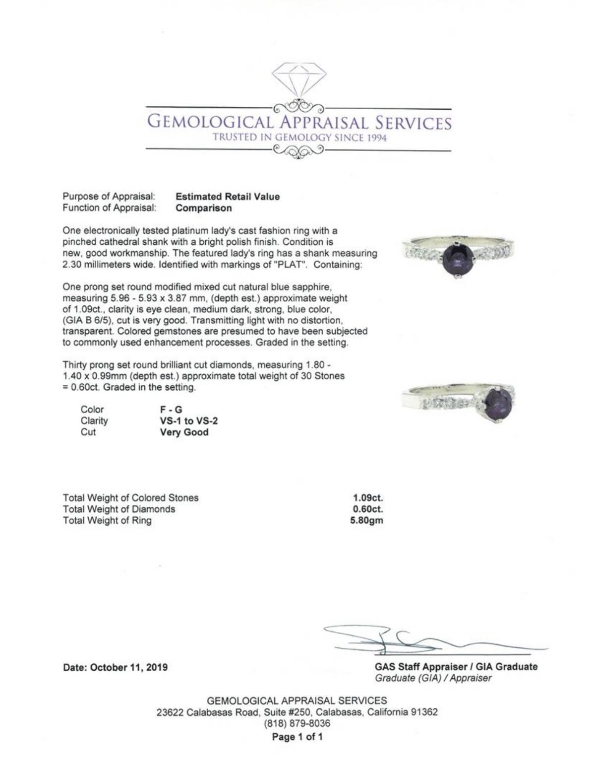 One electronically tested platinum lady's cast fashion ring with a pinched cathedral shank with a bright polish finish. The featured lady's ring has a shank measuring 2.30 millimeters wide. Identified with markings of 'PLAT'. Condition is new, good workmanship. Containing: One prong set round modified mixed cut natural blue sapphire, measuring 5.96 - 5.93 x 3.87 mm, (depth est.) approximate weight of 1.09ct., clarity is eye clean, medium dark, strong, blue color, (GIA B 6/5), cut is very good. Transmitting light with no distortion, transparent. Colored gemstones are presumed to have been subjected to commonly used enhancement processes. Graded in the setting. Thirty prong set round brilliant cut diamonds, measuring 1.80 - 1.40 x 0.99mm (depth est.) approximate total weight of 30 Stones = 0.60 ct. Graded in the setting. Color F - G Clarity VS-1 to VS-2 Cut Very Good. Total Weight of Colored Stones 1.09ct.. Total Weight of Diamonds 0.60 ct.. Total Weight of Ring 5.80gm GAS Appraised at $4695.00. GAS Appraised.