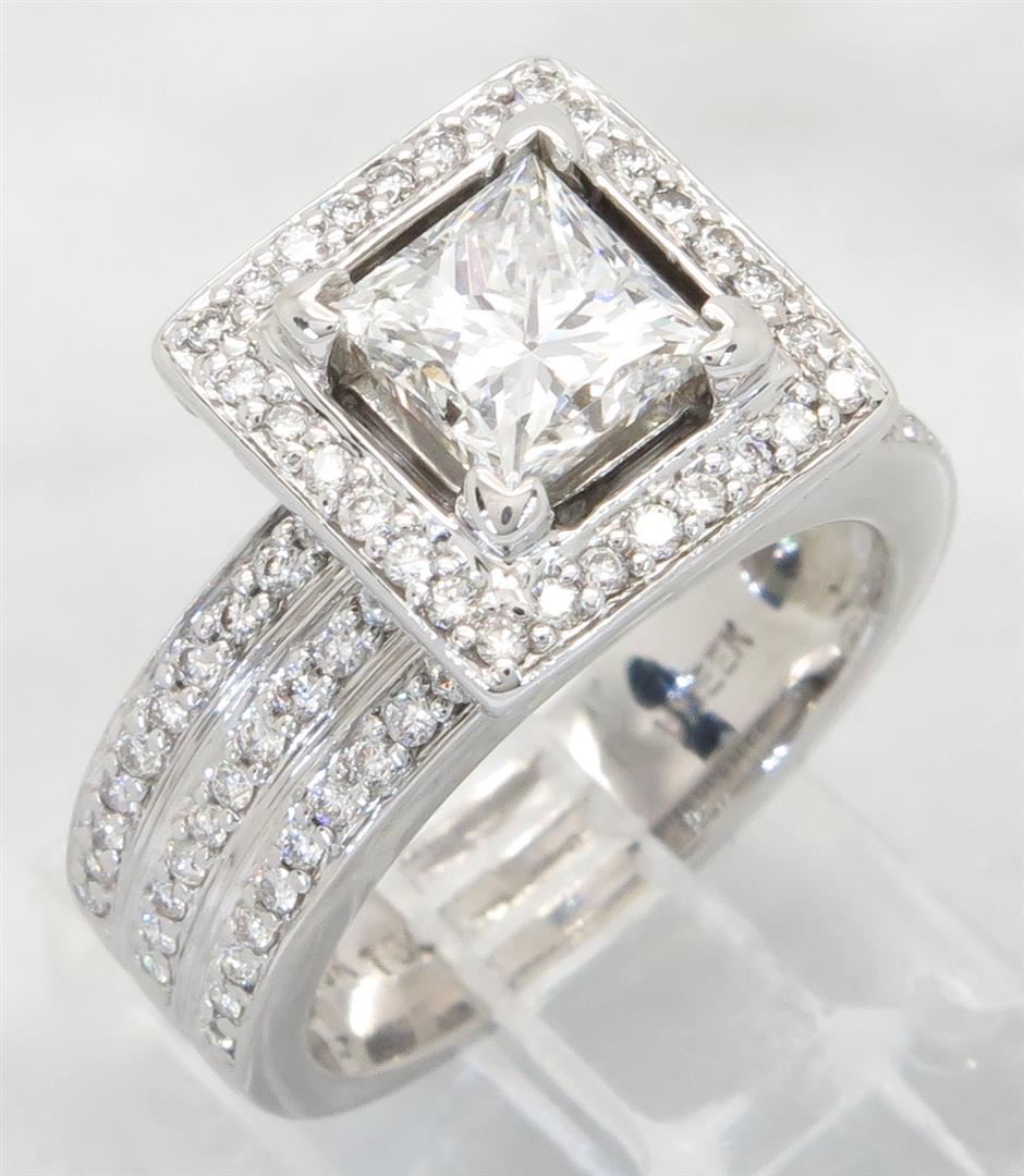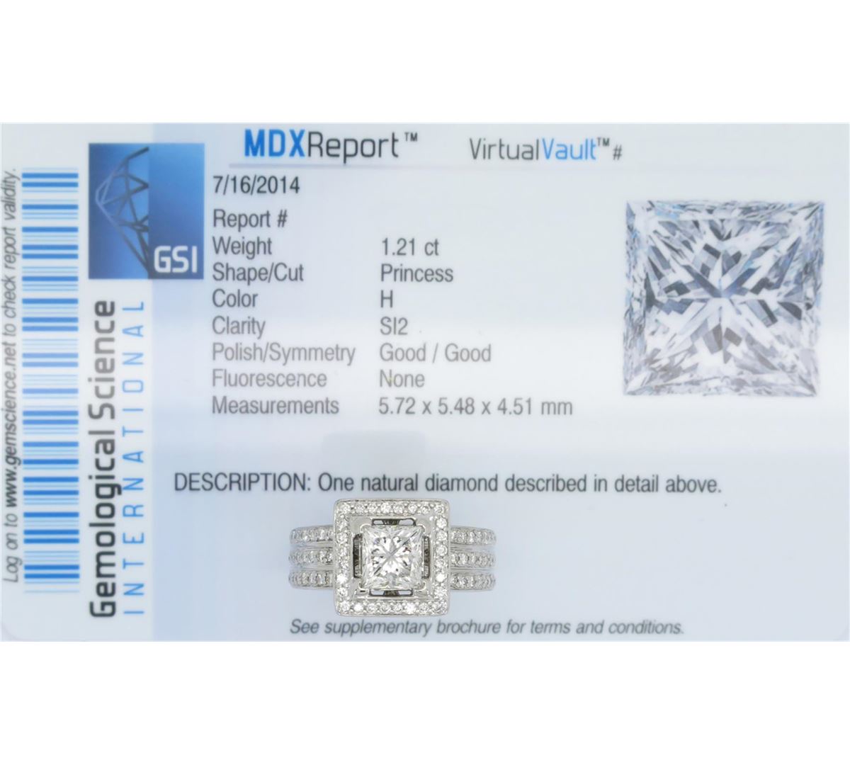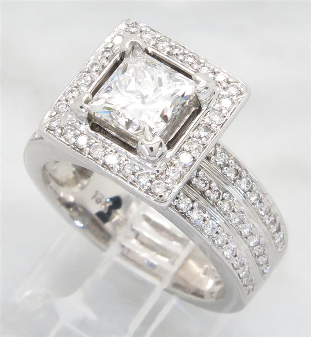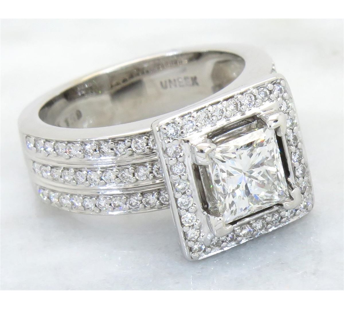 One tested 18K white gold diamond ring by designer "Uneek". Containing: One GSI Certified Princess Cut Diamond. Size: 1.21CT, Clarity: SI, Color: H. 89 Round Brilliant Cut Diamonds. Approximate total diamond weight: 1.70CTW. All diamonds are graded in the mounting unless otherwise stated. Weight of ring: 8.2 grams, Size: 4.5. GSI Appraised.