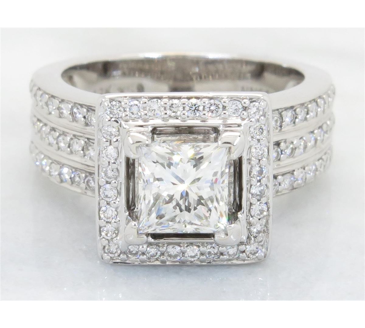 One tested 18K white gold diamond ring by designer "Uneek". Containing: One GSI Certified Princess Cut Diamond. Size: 1.21CT, Clarity: SI, Color: H. 89 Round Brilliant Cut Diamonds. Approximate total diamond weight: 1.70CTW. All diamonds are graded in the mounting unless otherwise stated. Weight of ring: 8.2 grams, Size: 4.5. GSI Appraised.