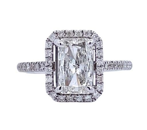 One electronically tested 14KT white gold lady's cast fashion emerald shaped halo wedding ring with a cathedral shank with a bright polish finish. The featured lady's ring has a shank measuring 1.70 millimeters wide. Identified with markings of "14K". Condition is new, good workmanship. Containing: One prong set radiant shaped cut diamond, measuring 8.80 x 5.48 x 3.30mm (depth est.) , 10.00% GTCF approximate weight of 1.50ct. Graded in the setting. Color H - I Clarity SI-1 Cut Very Good Forty prong set round brilliant cut diamonds, measuring 1.10 - 1.05 x 0.67mm (depth est.) approximate total weight of 40 Stones = 0.20ct. Graded in the setting. Color G - H Clarity VS-1 to SI-1 Cut Very Good Total Weight of Diamonds 1.70ct. Total Weight of Wedding Ring 2.80gm