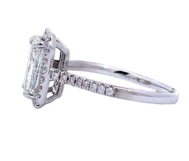 One electronically tested 14KT white gold lady's cast fashion emerald shaped halo wedding ring with a cathedral shank with a bright polish finish. The featured lady's ring has a shank measuring 1.70 millimeters wide. Identified with markings of "14K". Condition is new, good workmanship. Containing: One prong set radiant shaped cut diamond, measuring 8.80 x 5.48 x 3.30mm (depth est.) , 10.00% GTCF approximate weight of 1.50ct. Graded in the setting. Color H - I Clarity SI-1 Cut Very Good Forty prong set round brilliant cut diamonds, measuring 1.10 - 1.05 x 0.67mm (depth est.) approximate total weight of 40 Stones = 0.20ct. Graded in the setting. Color G - H Clarity VS-1 to SI-1 Cut Very Good Total Weight of Diamonds 1.70ct. Total Weight of Wedding Ring 2.80gm