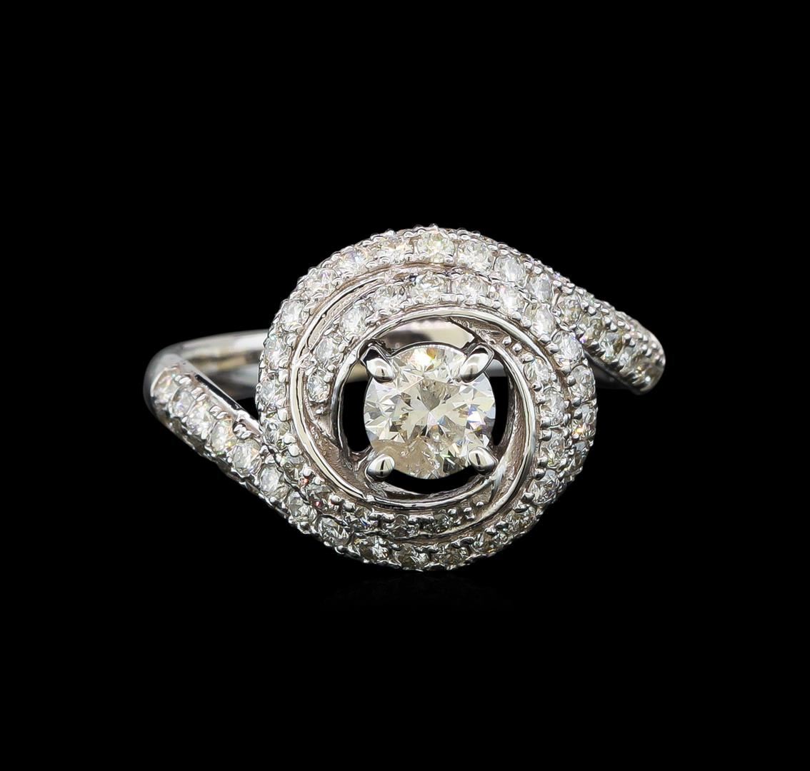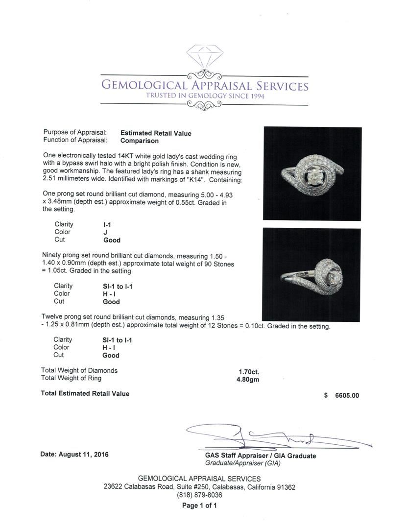 One electronically tested 14KT white gold lady's cast wedding ring with a bypass swirl halo with a bright polish finish. The featured lady's ring has a shank measuring 2.51 millimeters wide. Identified with markings of 'K14'. Condition is new, good workmanship. Containing: One prong set round brilliant cut diamond, measuring 5.00 - 4.93 x 3.48mm (depth est.) approximate weight of 0.55ct. Graded in the setting. Clarity I-1. Color: J Cut Good Ninety prong set round brilliant cut diamonds, measuring 1.50 - 1.40 x 0.90mm (depth est.) approximate total weight of 90 Stones = 1.05ct. Graded in the setting. Clarity SI-1 to I-1. Color: H - I Cut Good Twelve prong set round brilliant cut diamonds, measuring 1.35 - 1.25 x 0.81mm (depth est.) approximate total weight of 12 Stones = 0.10ct. Graded in the setting. Clarity SI-1 to I-1. Color: H - I Cut Good. Total Weight of Diamonds 1.70ct.. Total Weight of Ring 4.80gm. GAS Appraised at $6,605.00.