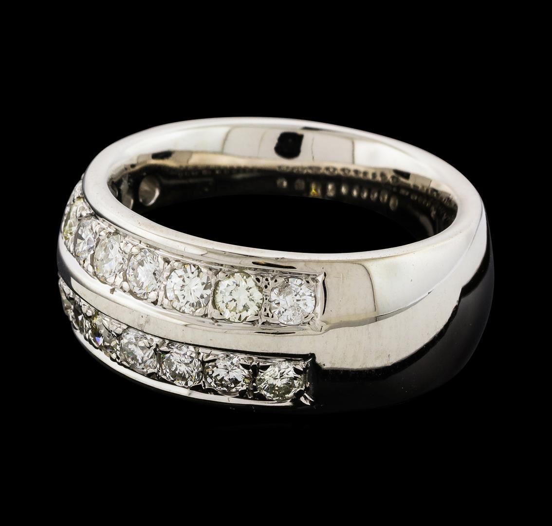 One electronically tested 14KT white gold man's cast two row wedding band with a bright polish finish. The featured man's ring has a shank measuring 9.48 millimeters wide. Identified with markings of '14K'. Condition is new, good workmanship. Containing: Twenty bead set round brilliant cut diamonds, measuring 2.90 - 2.70 x 1.74mm (depth est.) approximate total weight of 20 Stones = 1.70ct. Graded in the setting. Clarity SI-1 to I-1. Color: H - J Cut Good. Total Weight of Diamonds 1.70ct.. Total Weight of Band 21.60gm. GAS Appraised at $6,010.00.