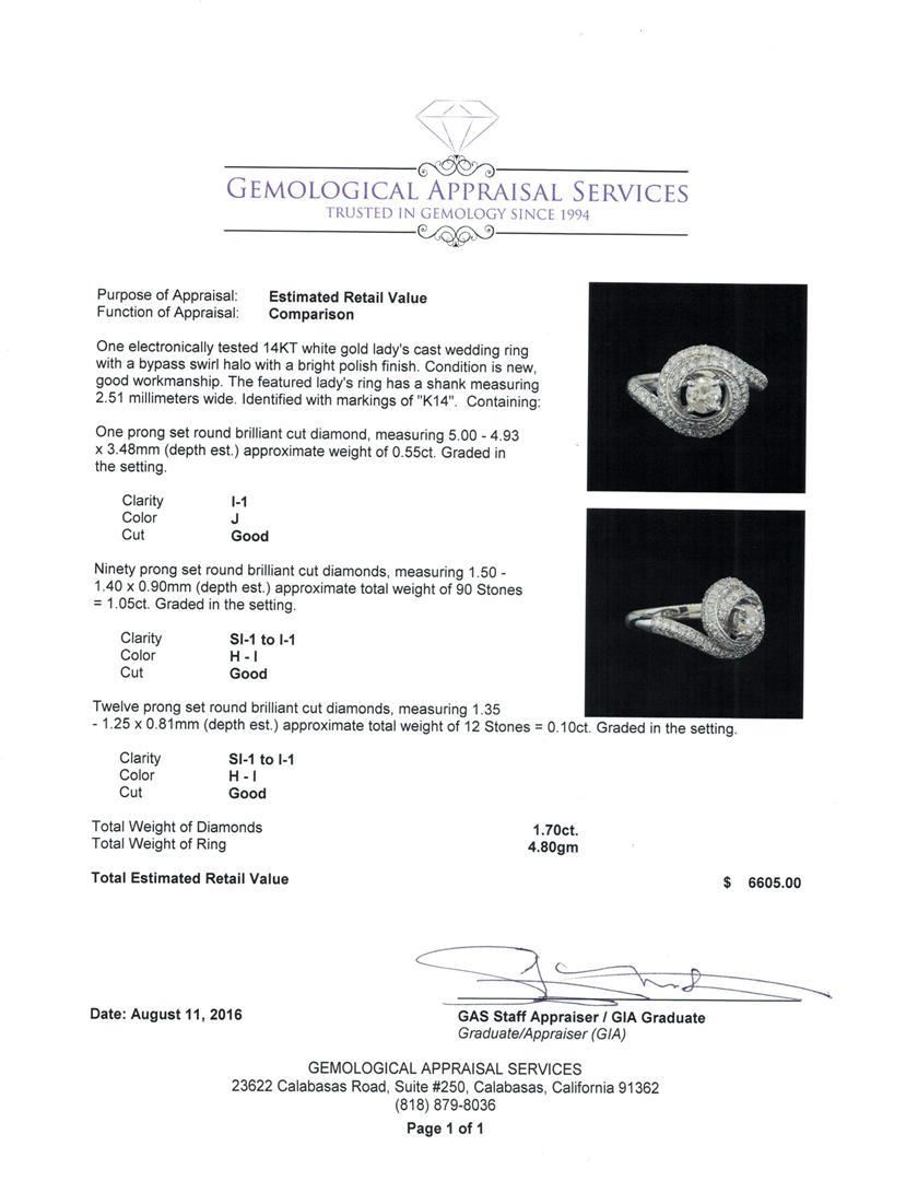One electronically tested 14KT white gold lady's cast wedding ring with a bypass swirl halo with a bright polish finish. The featured lady's ring has a shank measuring 2.51 millimeters wide. Identified with markings of 'K14'. Condition is new, good workmanship. Containing: One prong set round brilliant cut diamond, measuring 5.00 - 4.93 x 3.48mm (depth est.) approximate weight of 0.55ct. Graded in the setting. Clarity I-1. Color: J Cut Good Ninety prong set round brilliant cut diamonds, measuring 1.50 - 1.40 x 0.90mm (depth est.) approximate total weight of 90 Stones = 1.05ct. Graded in the setting. Clarity SI-1 to I-1. Color: H - I Cut Good Twelve prong set round brilliant cut diamonds, measuring 1.35 - 1.25 x 0.81mm (depth est.) approximate total weight of 12 Stones = 0.10 ct. Graded in the setting. Clarity SI-1 to I-1. Color: H - I Cut Good. Total Weight of Diamonds 1.70 ct.. Total Weight of Ring 4.80gm. GAS Appraised.